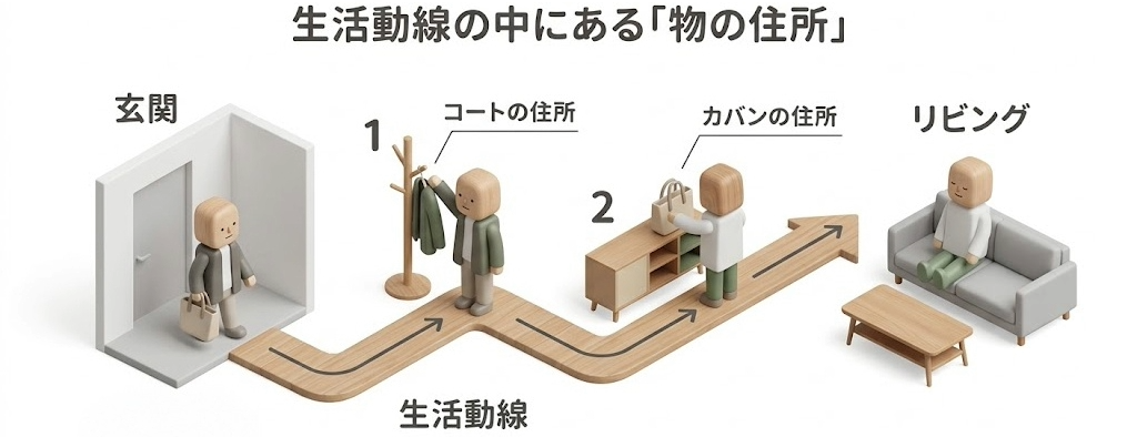 これを防ぐためには、生活の中で自然に通る場所に物の置き場を作ることが最重要です。たとえば、玄関からリビングへ向かう途中に小さな棚やフックがあるだけで、カバンがリビングまで持ち込まれるのを防げます。