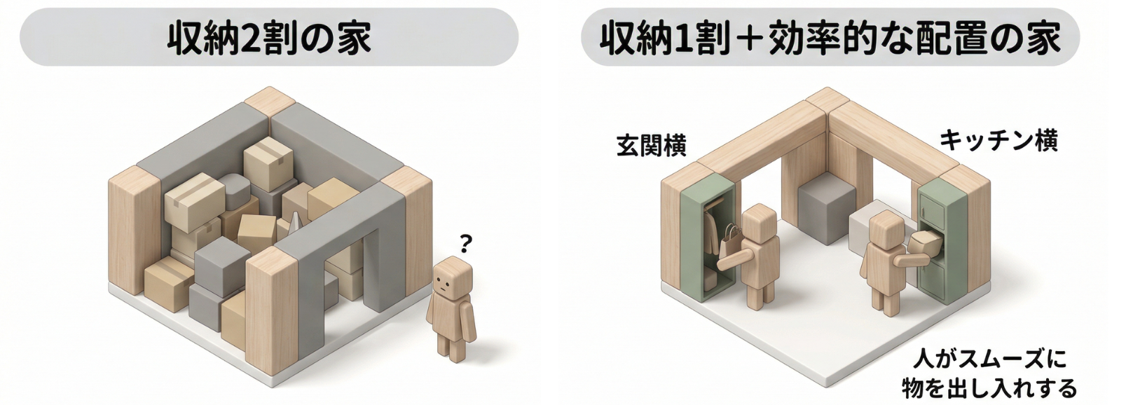 収納の適正量とは、単に面積を広くとることではなく、生活の流れに沿って「必要な場所に適切な容量が配置されている状態」を指します。