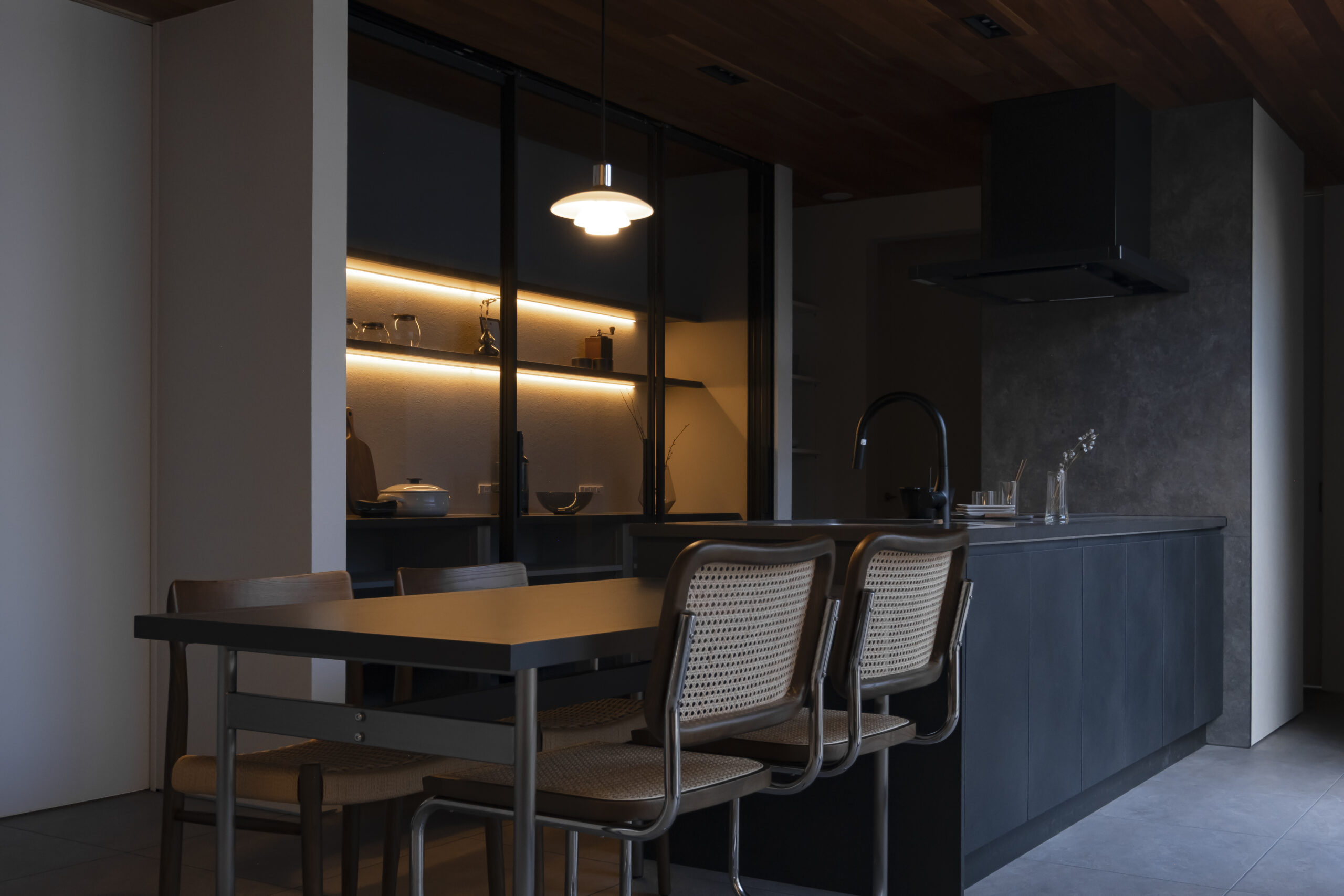救急箱や爪切り、書類などの日用品は、キッチンの対面カウンターの下に収納を設けることで、座ったまま取り出せて、かつ来客からは見えにくい便利な場所になります。