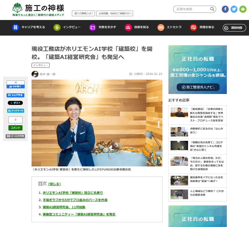 この度、2026年1月22日公開の建設業界特化型Webメディア『施工の神様』にて、弊社LIFEFUNDが運営する「ホリエモンAI学校 建築校」および代表・白都のインタビュー記事が大きく掲載されました。
