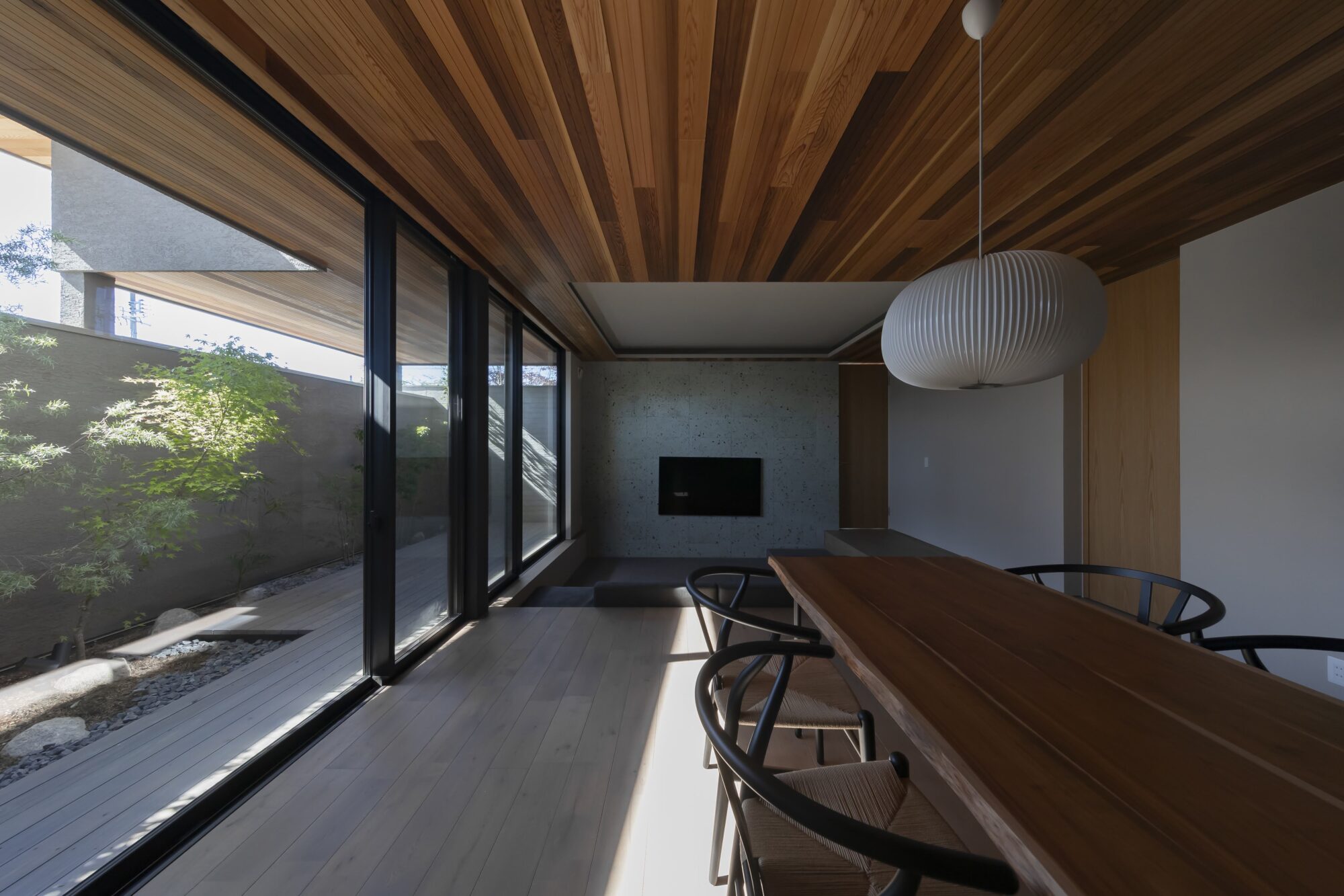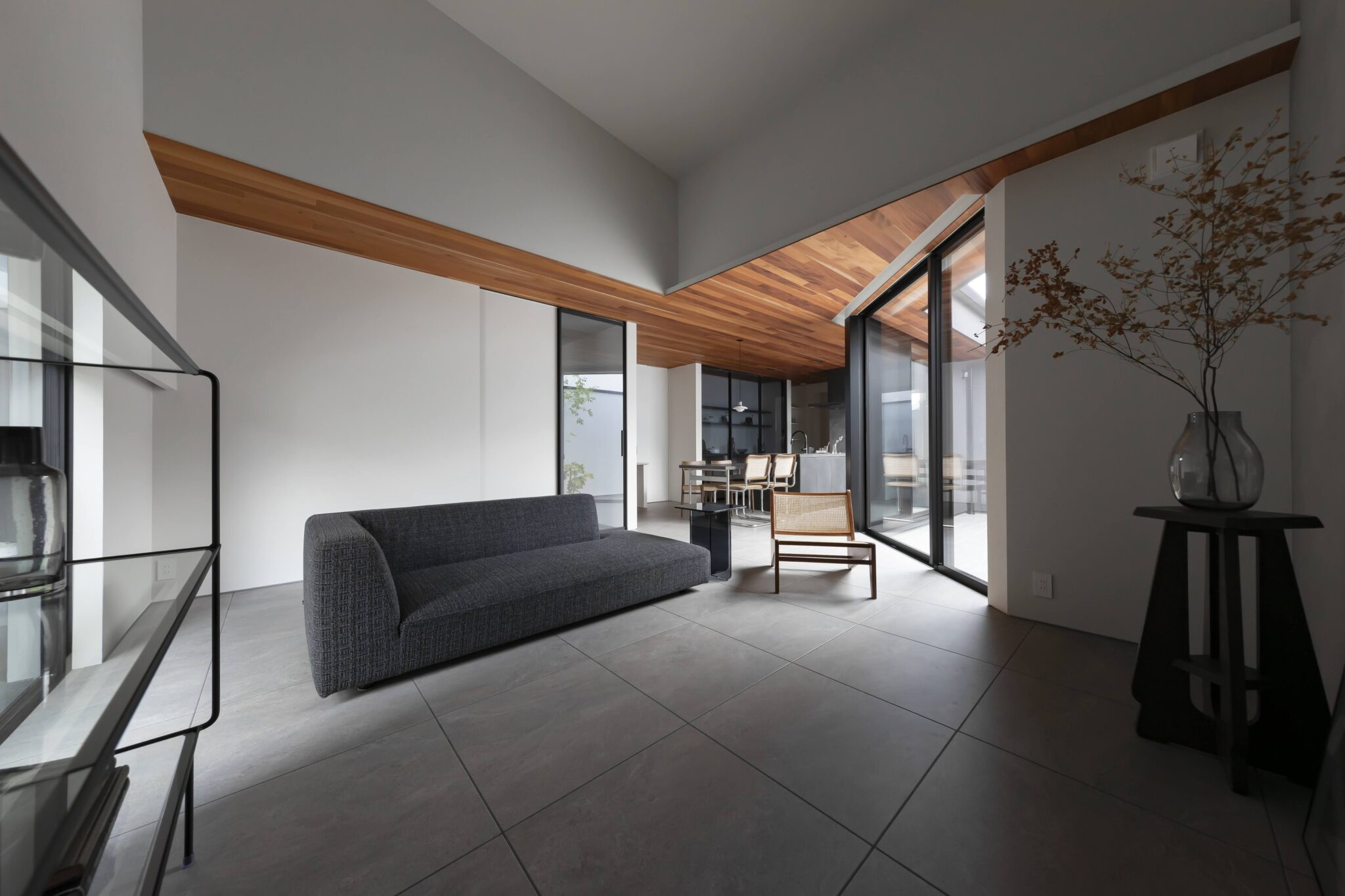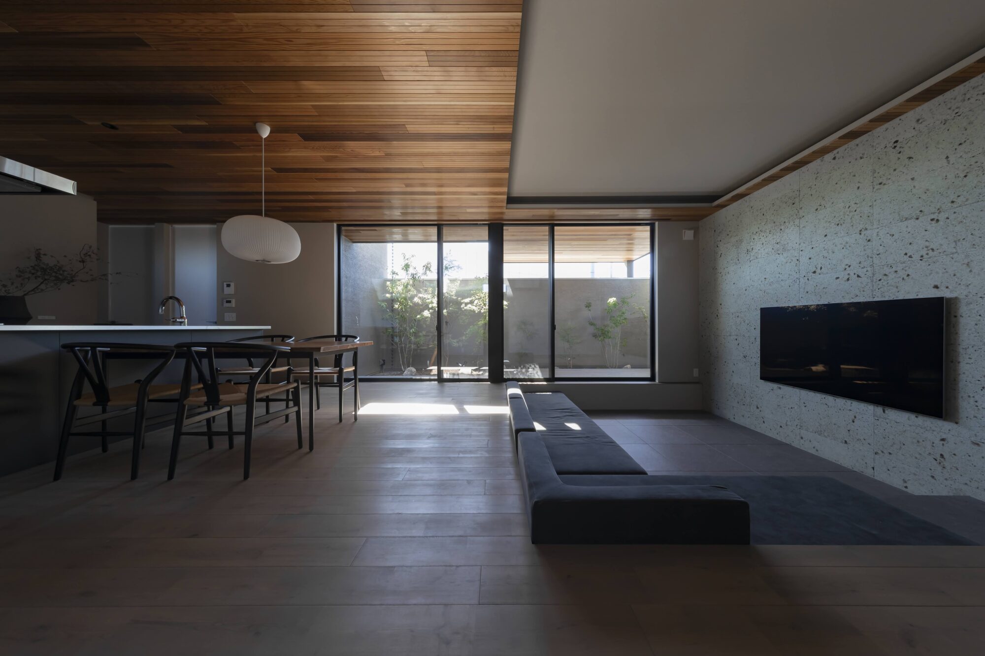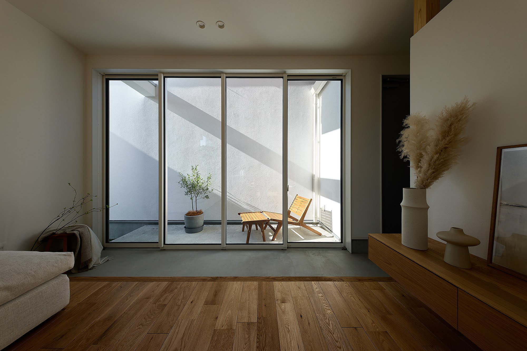 中庭との一体化: LDKの先に中庭を配置し、大開口の窓を設けます。外の景色を室内に取り込むことで、外壁までがリビングの一部のように感じられ、面積以上の贅沢さを味わえます。