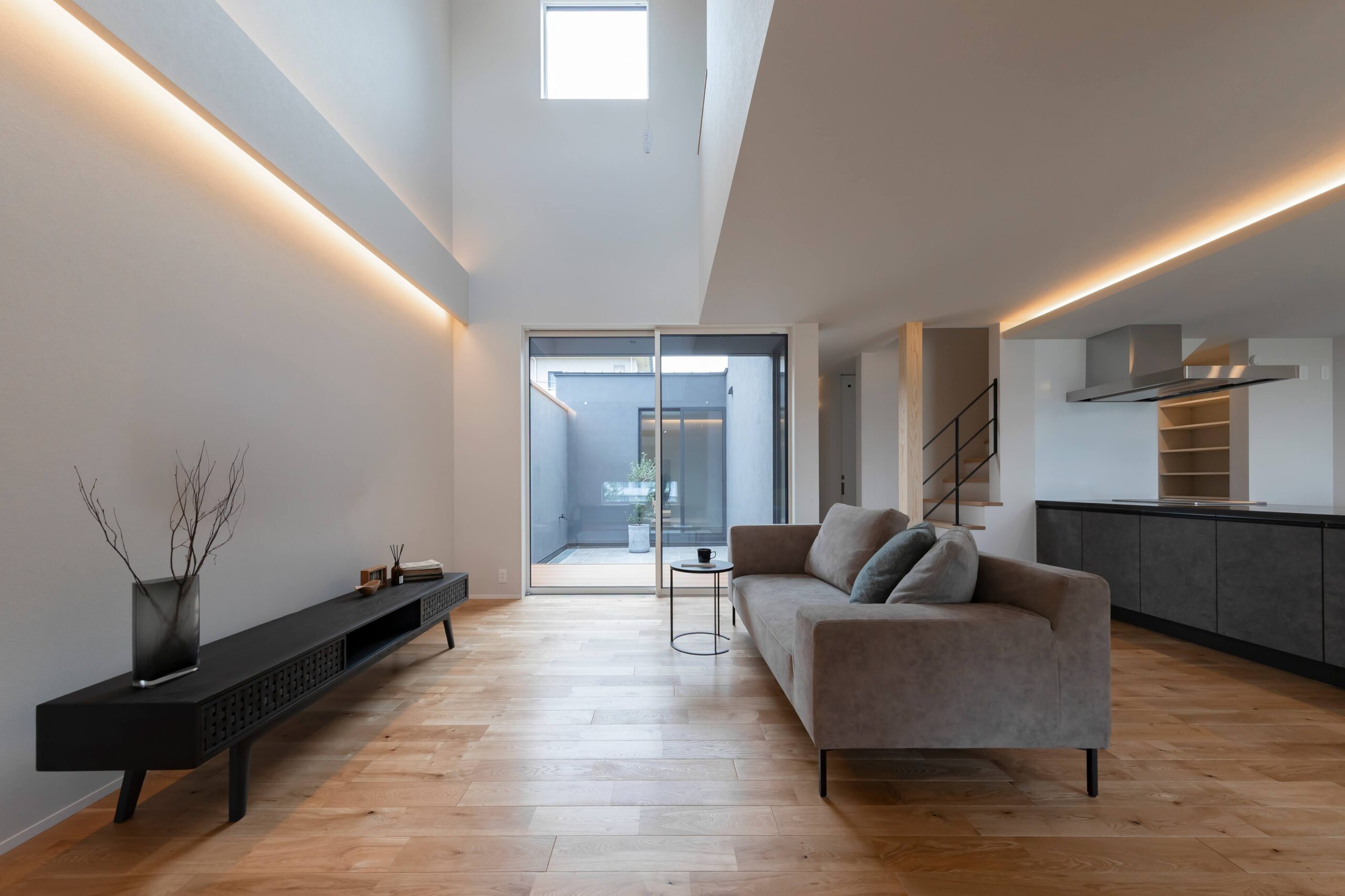 1階は大きな吹抜けのリビングを据え、中庭との一体感を重視。