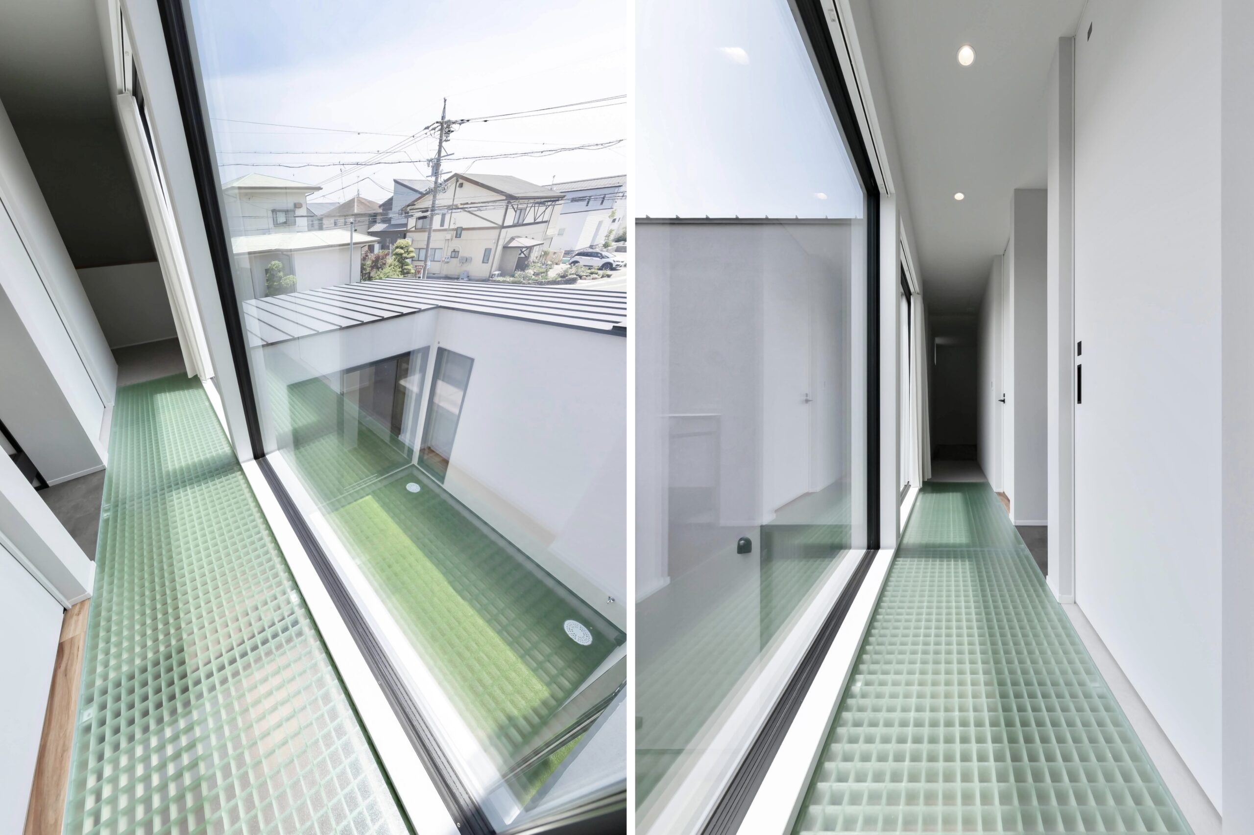 この半透過床は1階へ光を落とすための明かり取りの工夫で、住まい全体を明るく保つ鍵となっています。