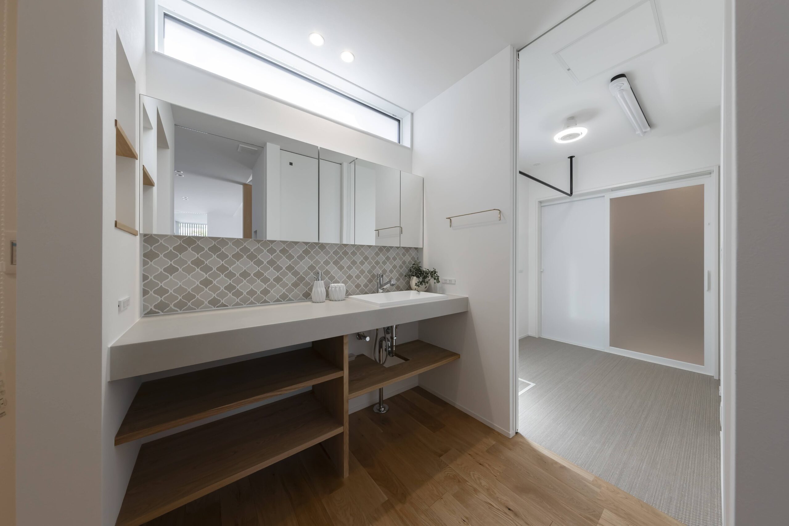 広さを確保したランドリーは、室内干し・外干しのどちらにも対応できます。外干しスペースは周囲から見えにくい位置に計画し、安心して干せる環境を整えました。