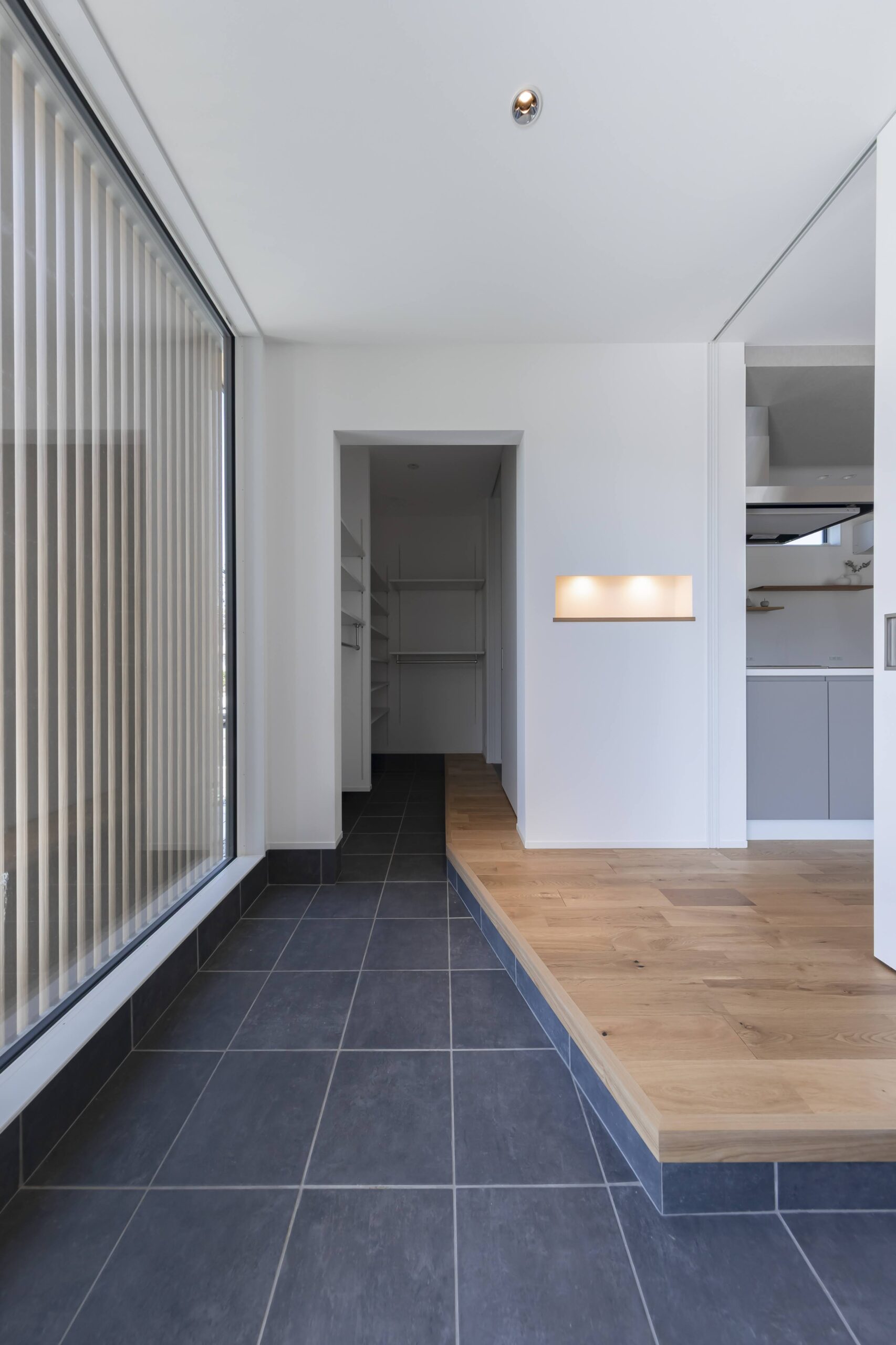 玄関 → パントリー → キッチンへと続く動線はコンパクトで快適。買い物帰りも効率よく片づけができ、