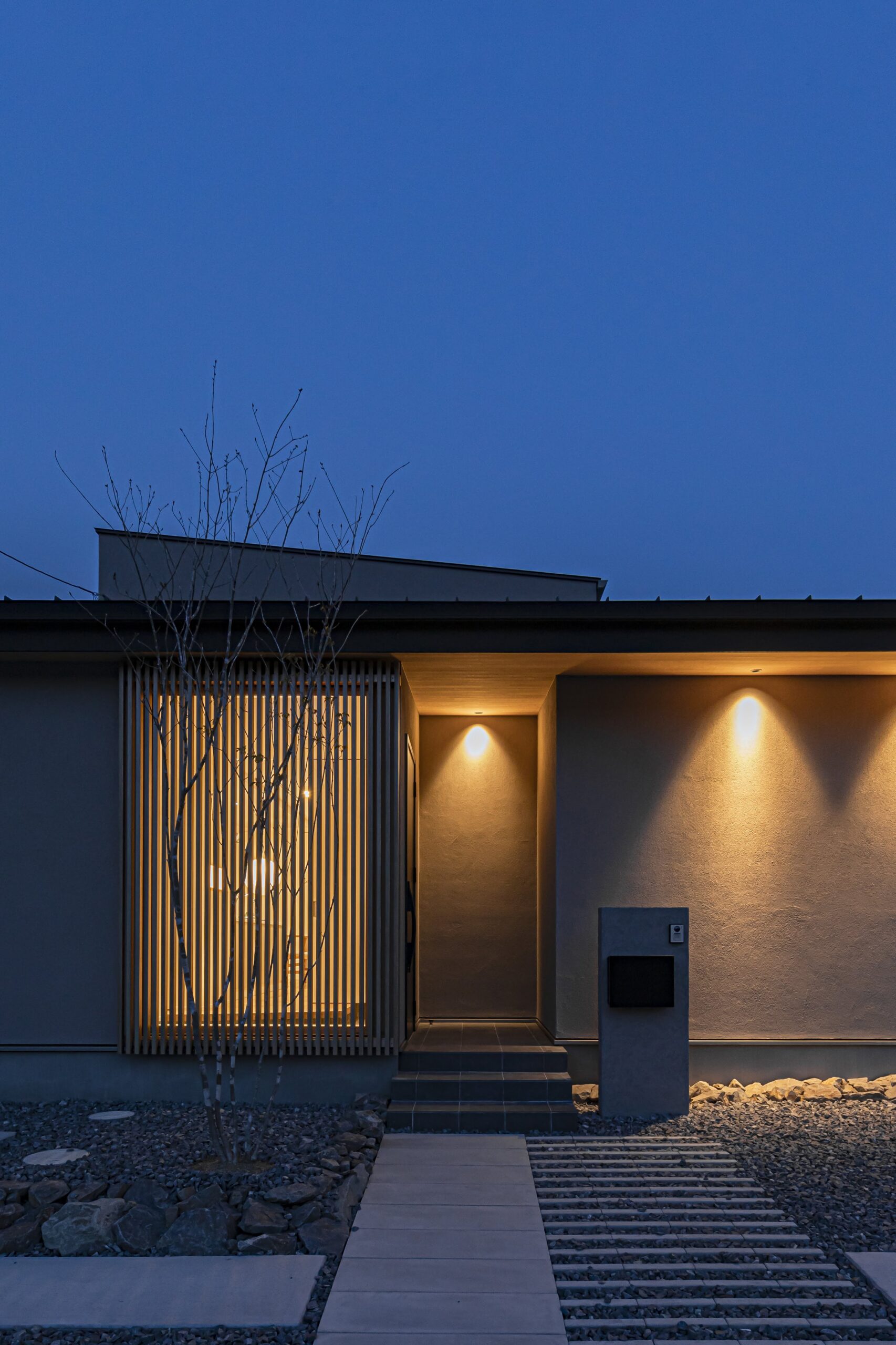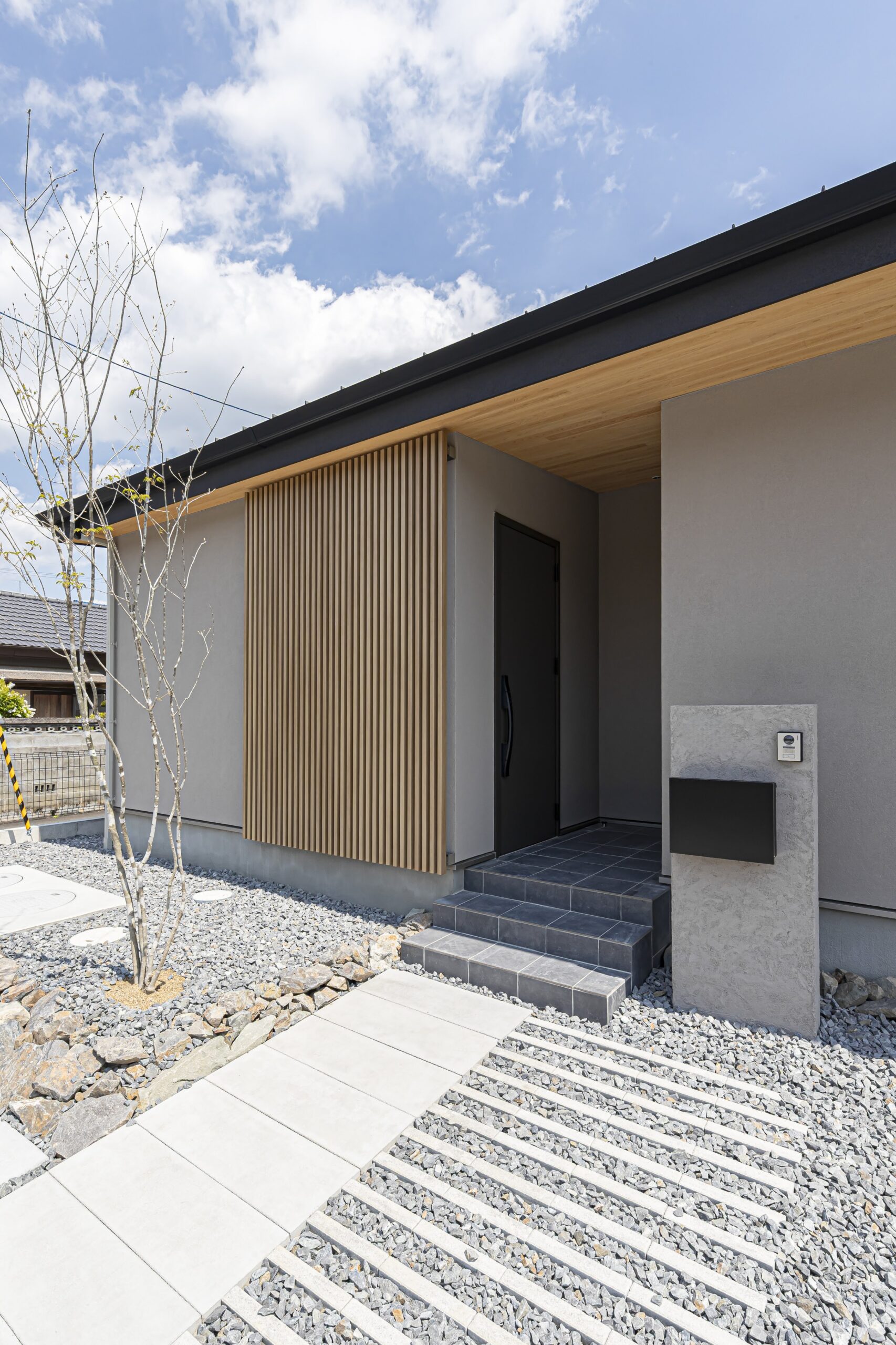 玄関は道路から見えにくい向きに配置し、格子窓から差し込む光が陰影をつくり出す、静かで落ち着いた佇まい。