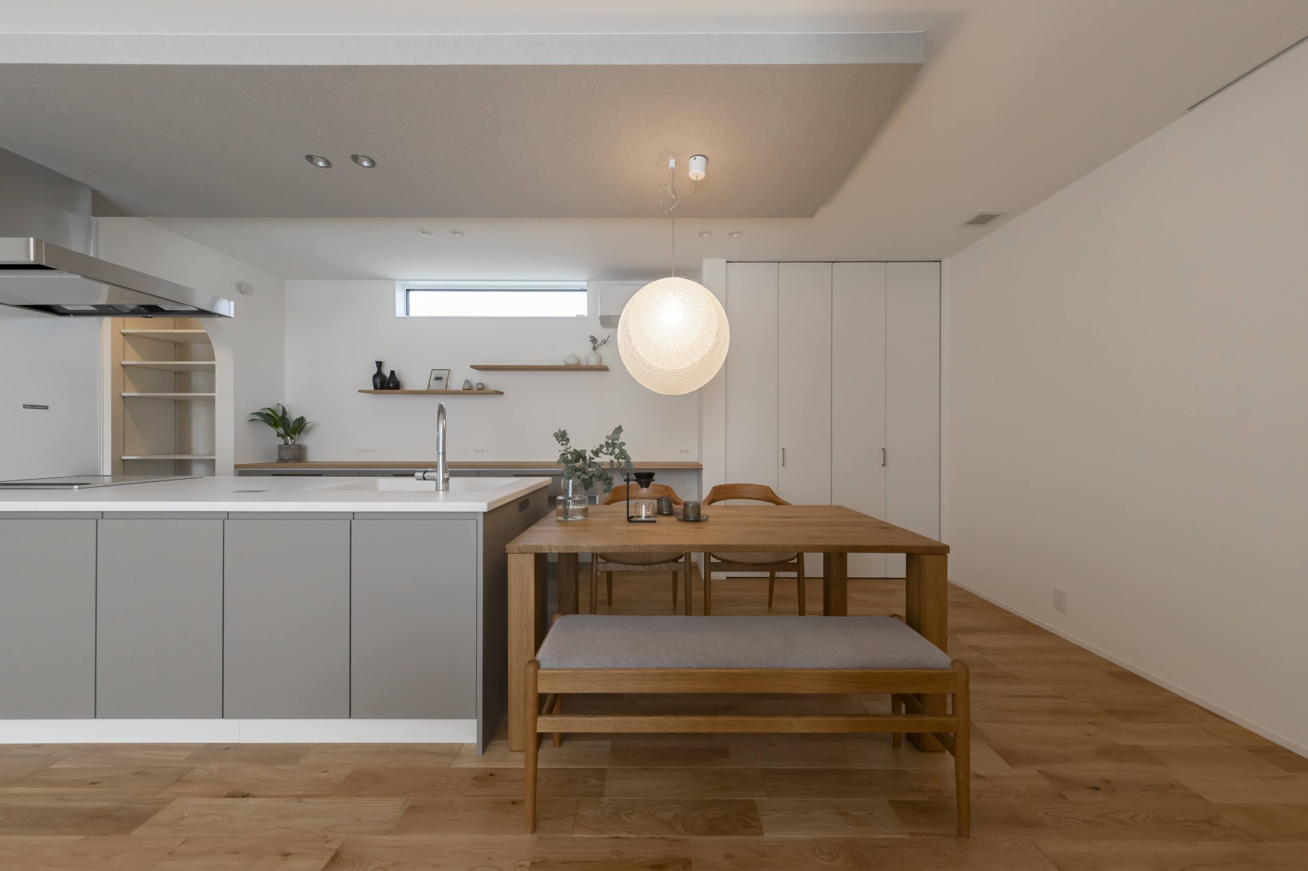 玄関には大容量のシューズクロークを設け、奥にはパントリーへとつながる裏動線を確保。帰宅後の荷物をスムーズに収納でき、生活感が表に出ないように工夫されています。