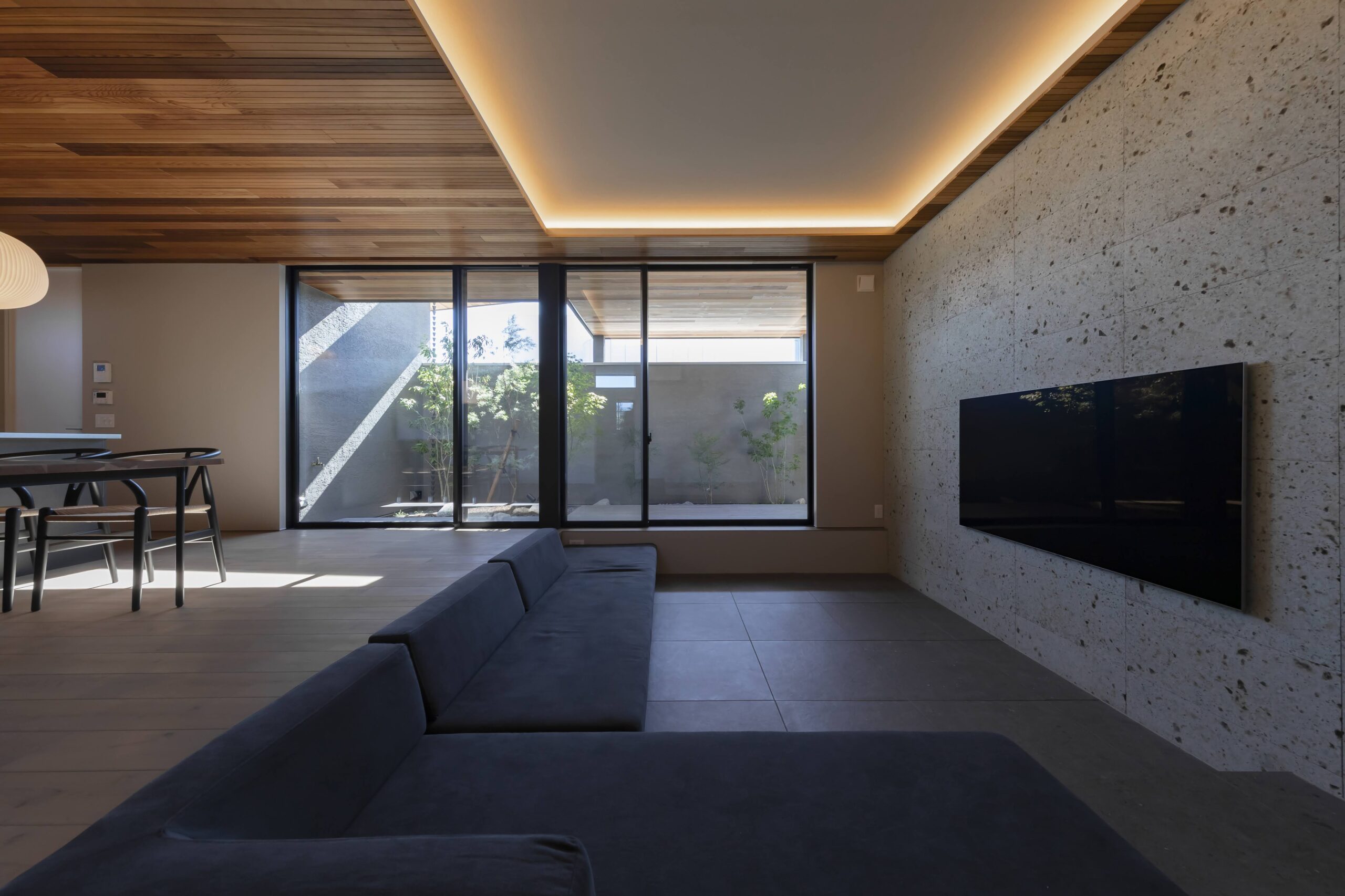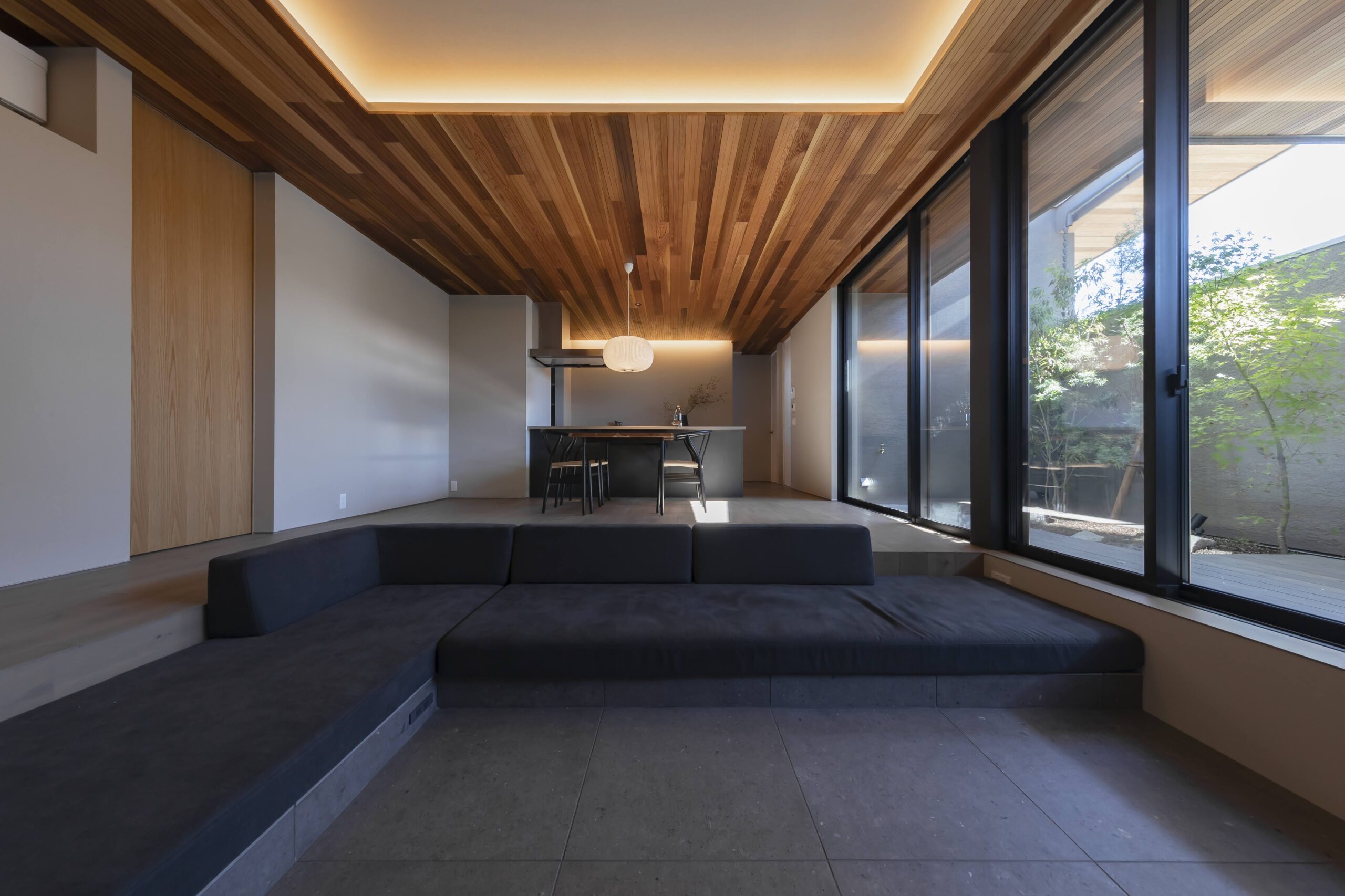 床をあえて下げたリビングは、中庭と視線がつながります。