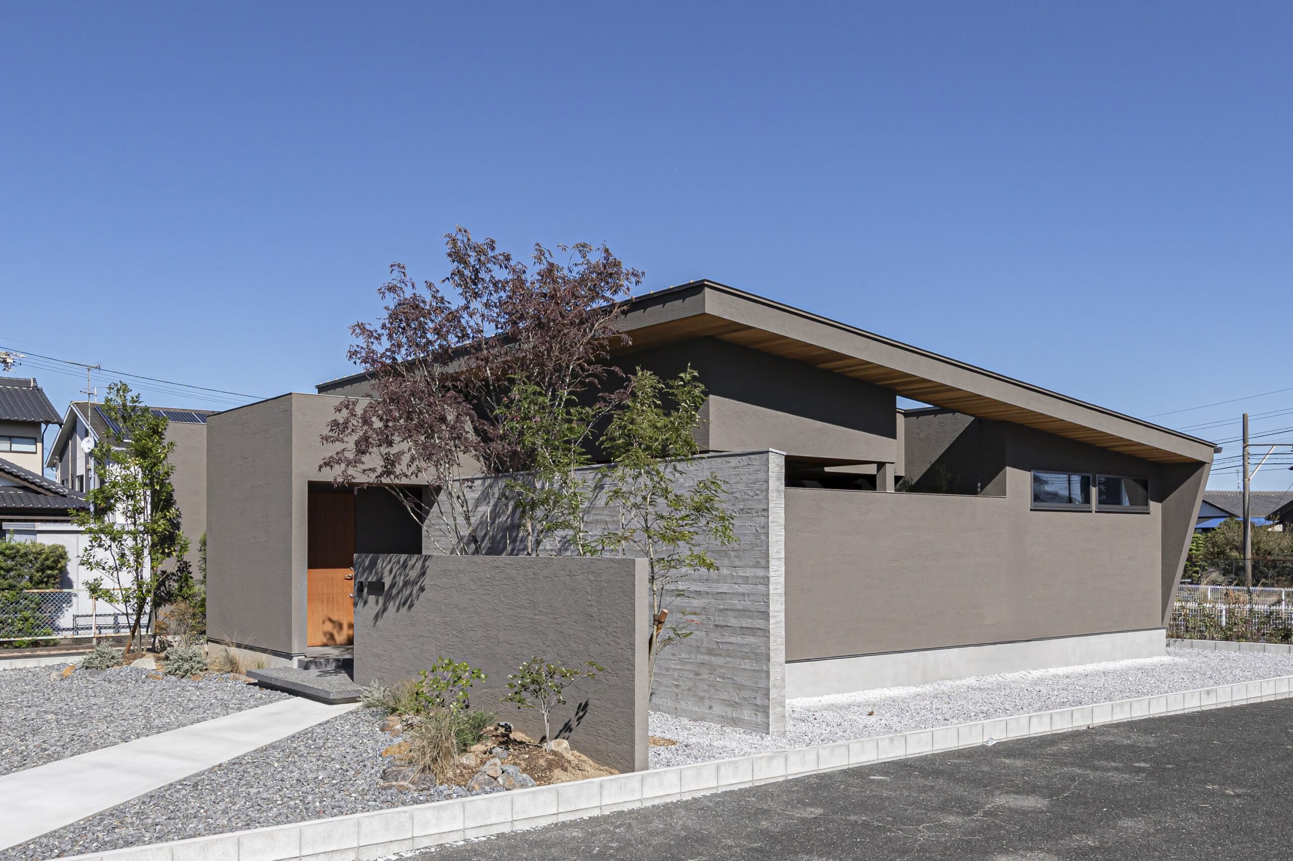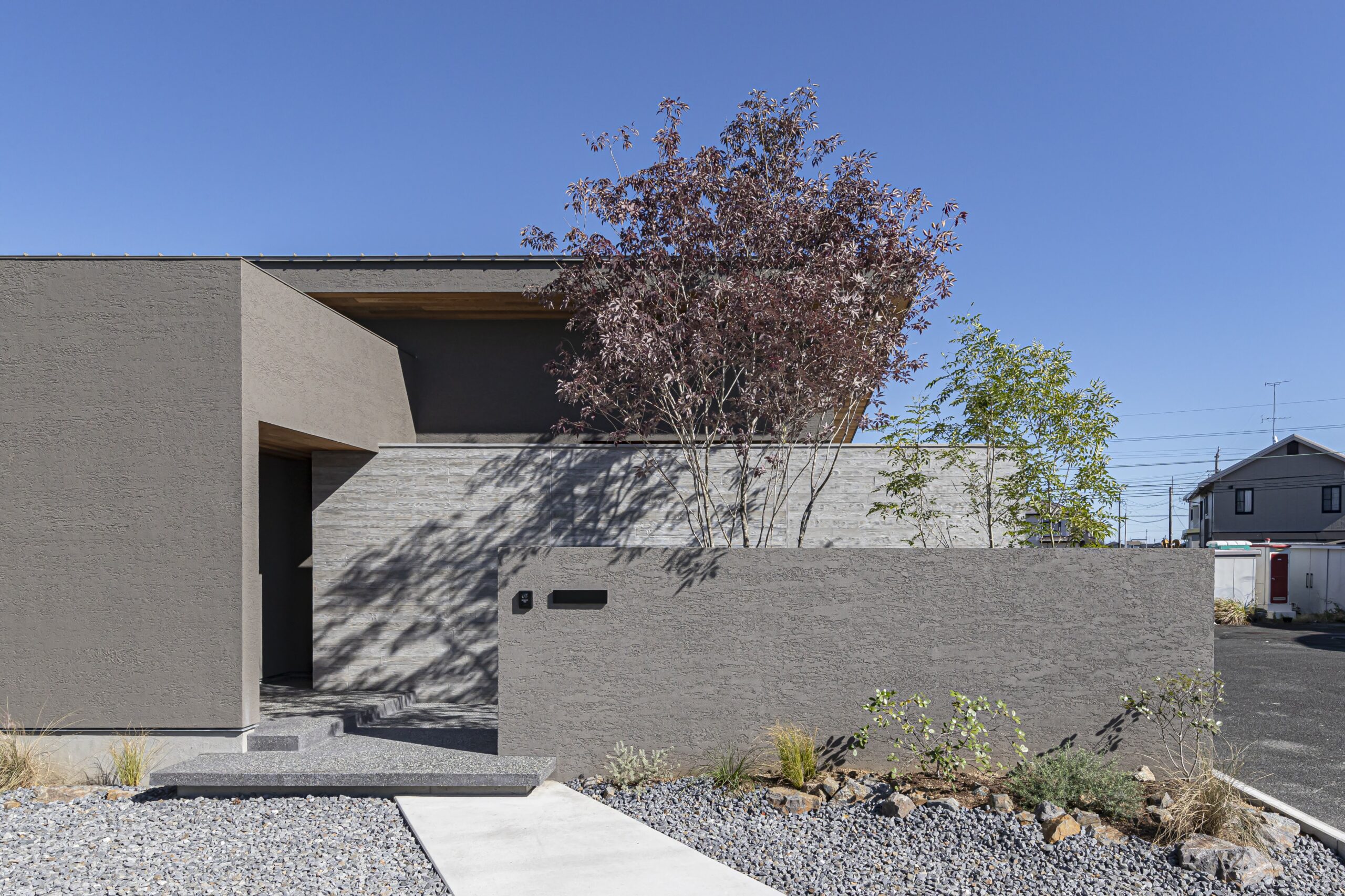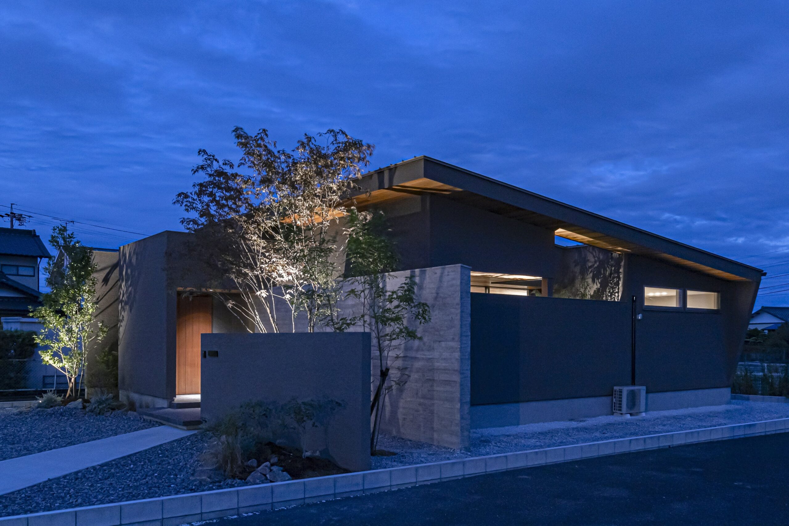 外観は、屋根にやさしい色合いのガルバリウム鋼板、トラバーチン仕上げの塗り壁、木の風合いを感じるモルタルを組み合わせ、シンプルでありながら上品で深みのある印象に仕上げました。