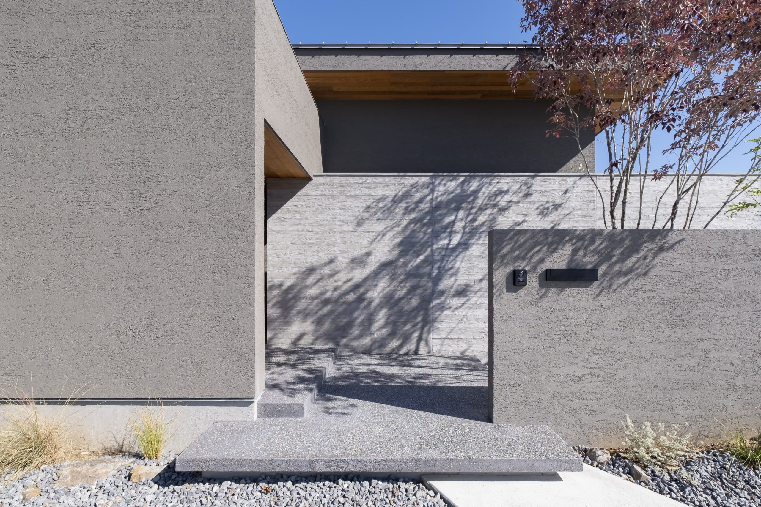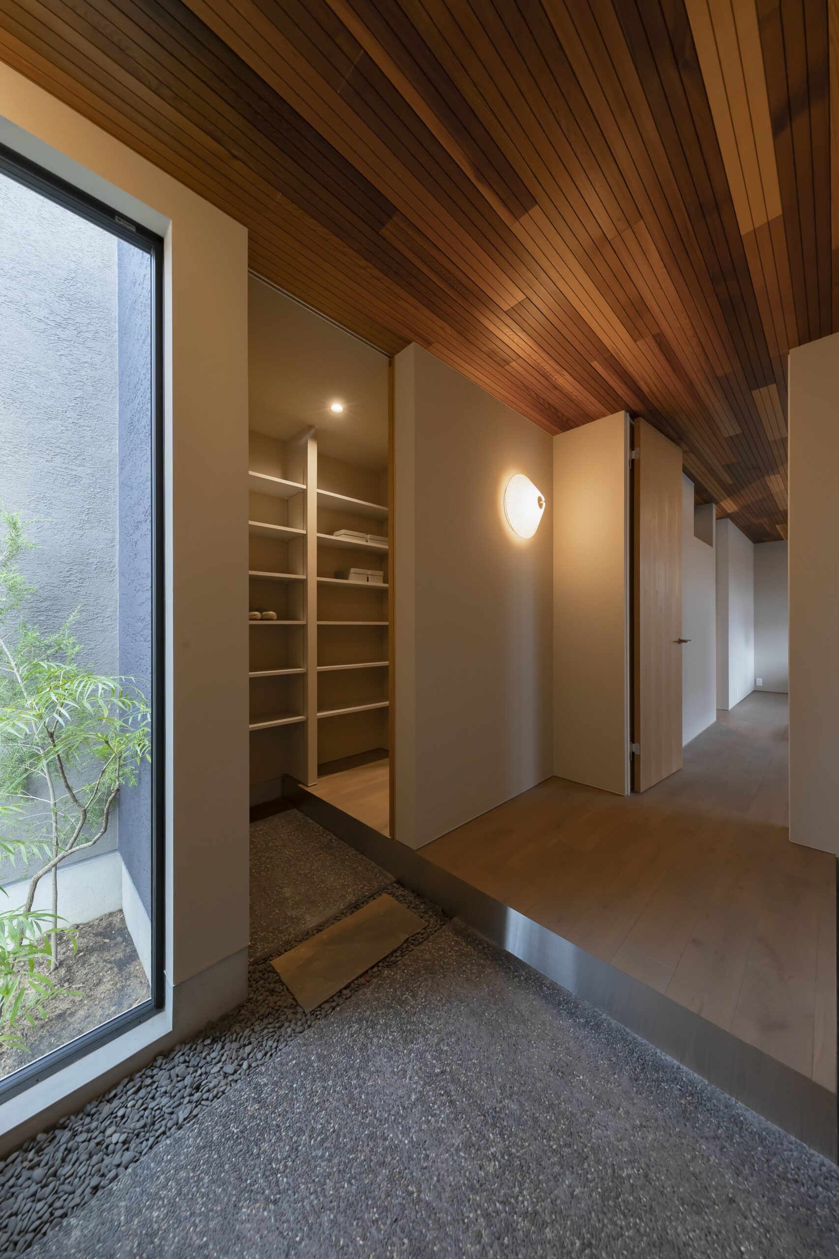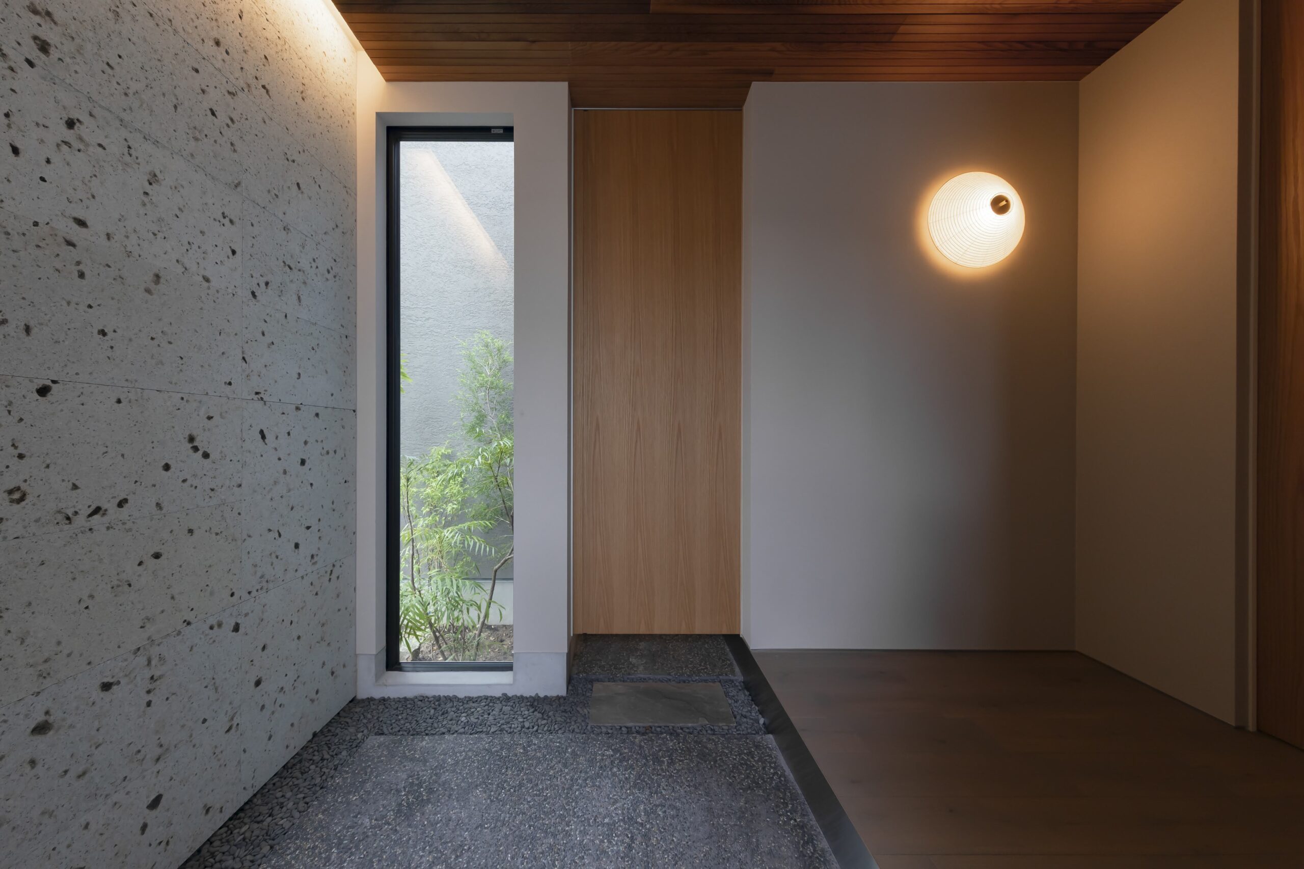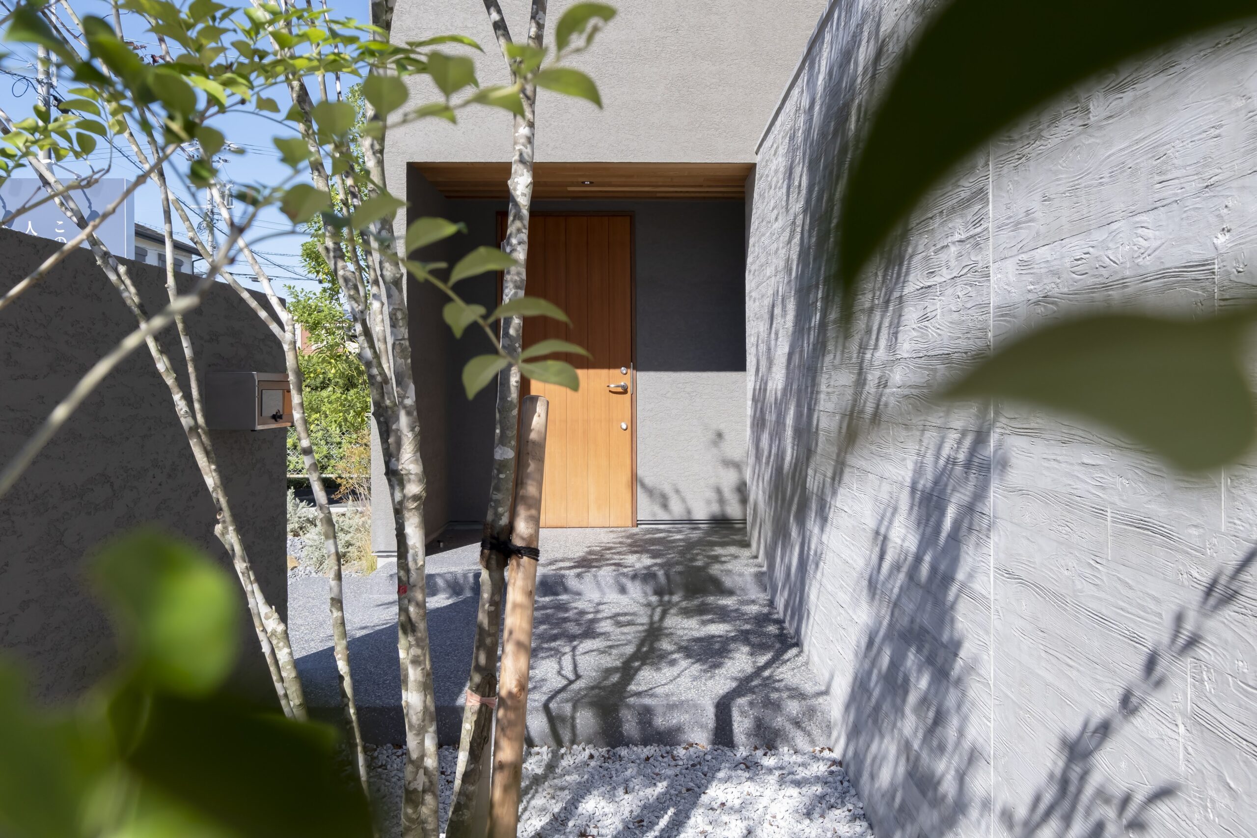 玄関は、“洗い出し仕上げ”を採用し、玉砂利の風合いと大谷石を組み合わせ、訪れる人を迎え入れる静けさと重厚感を演出。