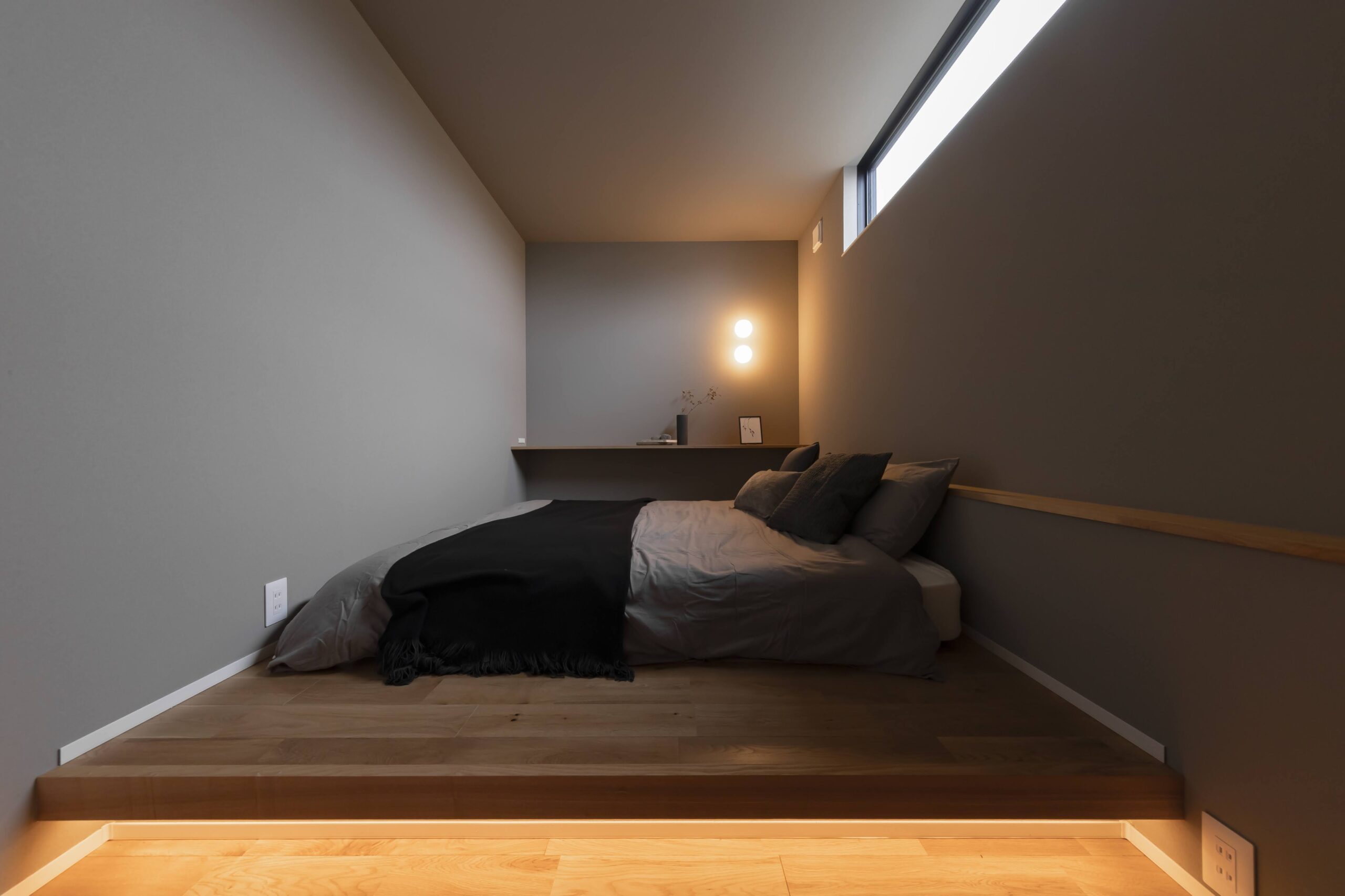 ベッドルームは、落ち着いたホテルライクな空間に。正面のカウンターは、ベッドに腰掛けて本を読んだり小物を置いたり、くつろぎながらも使いやすい設計。