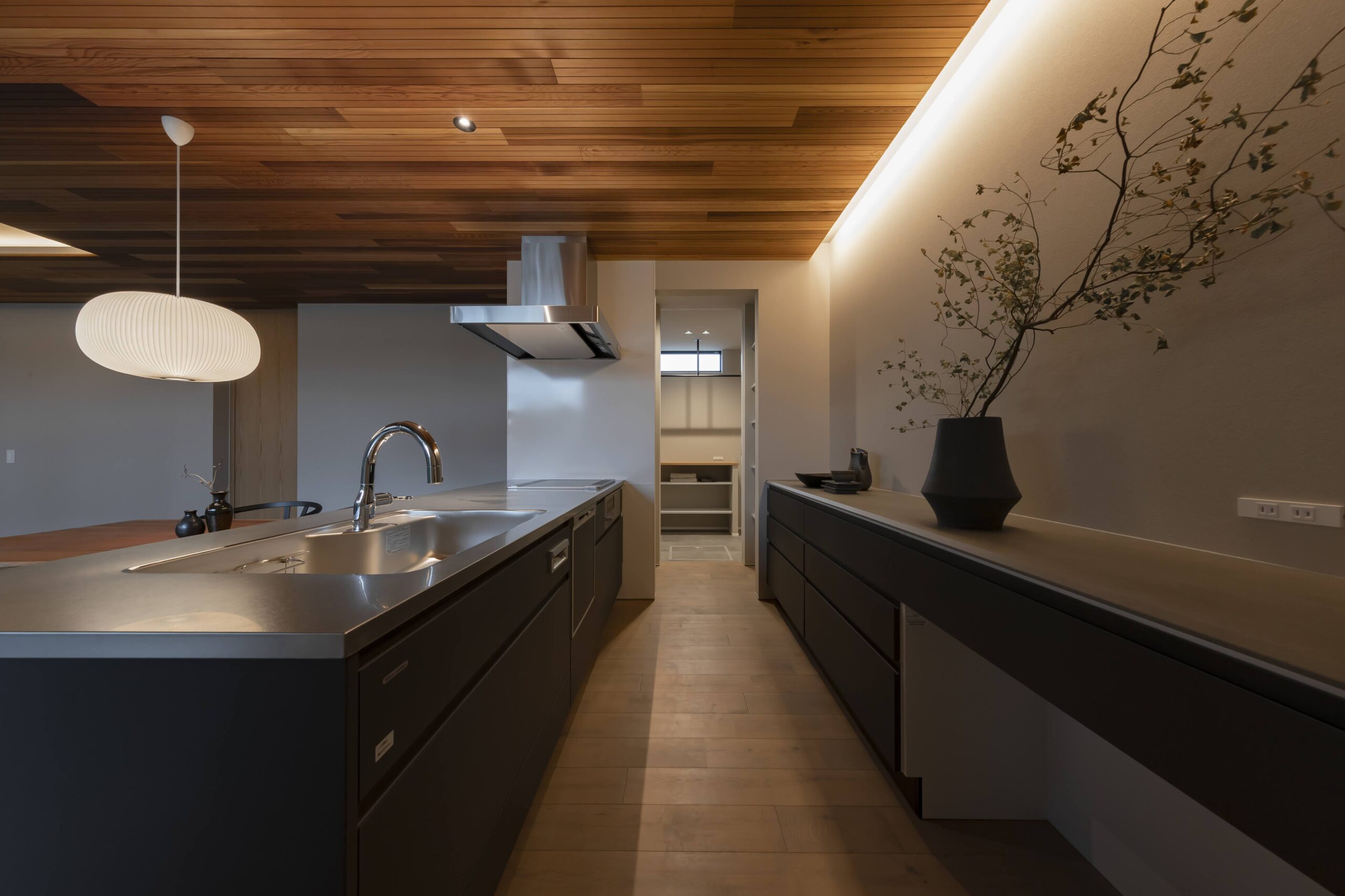 キッチンは、ブラックの面材で空間を引き締め、天板にはバイブレーション加工のステンレスを採用。