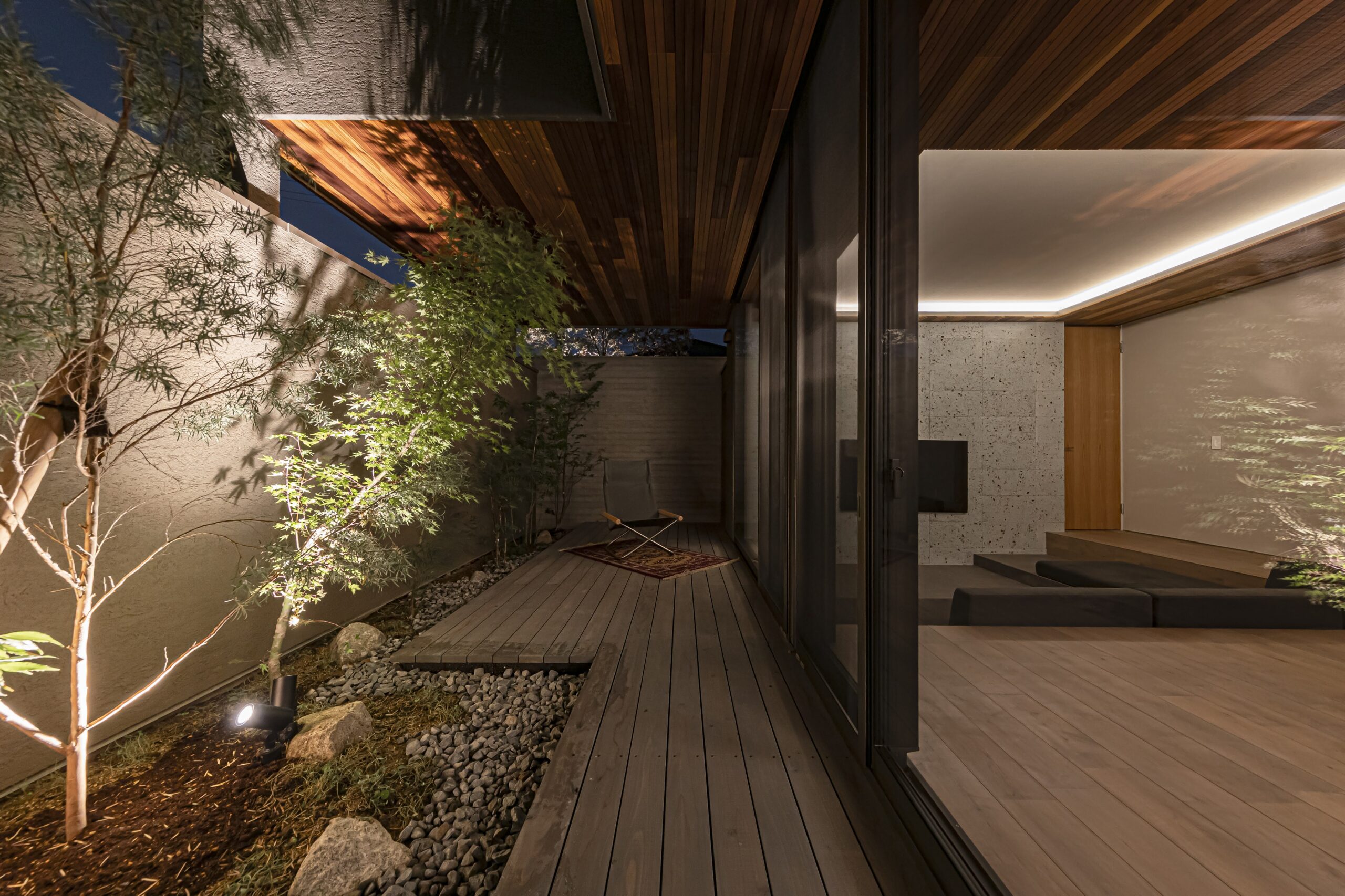 大きな窓の向こうに広がる中庭は、暮らしの中心。植栽や石、ウッドデッキが調和し、つい眺めていたくなる景色です。