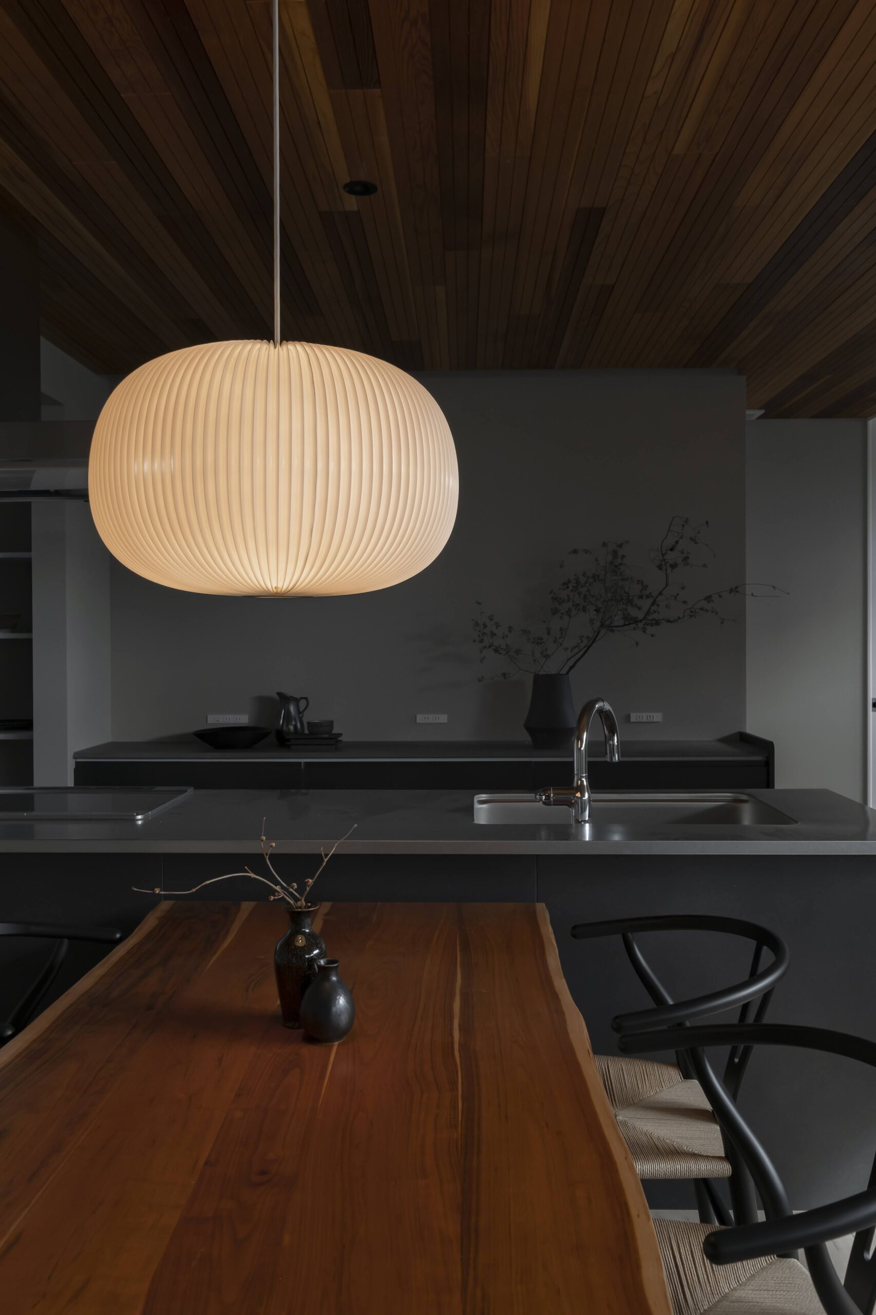 ダイニング照明には、レクリントの折り紙をヒントにしたプリーツシェードを選定。“和”の要素をさりげなく取り入れながら、優しい光が美しい陰影をつくり、穏やかな時間をもたらします。