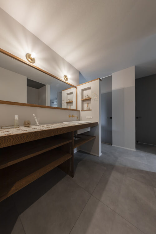 大容量のパントリーやゆとりある洗面台、室内外干しに対応した水まわりなど、日常の手間をそっと受け止める仕掛けが随所に息づきます。