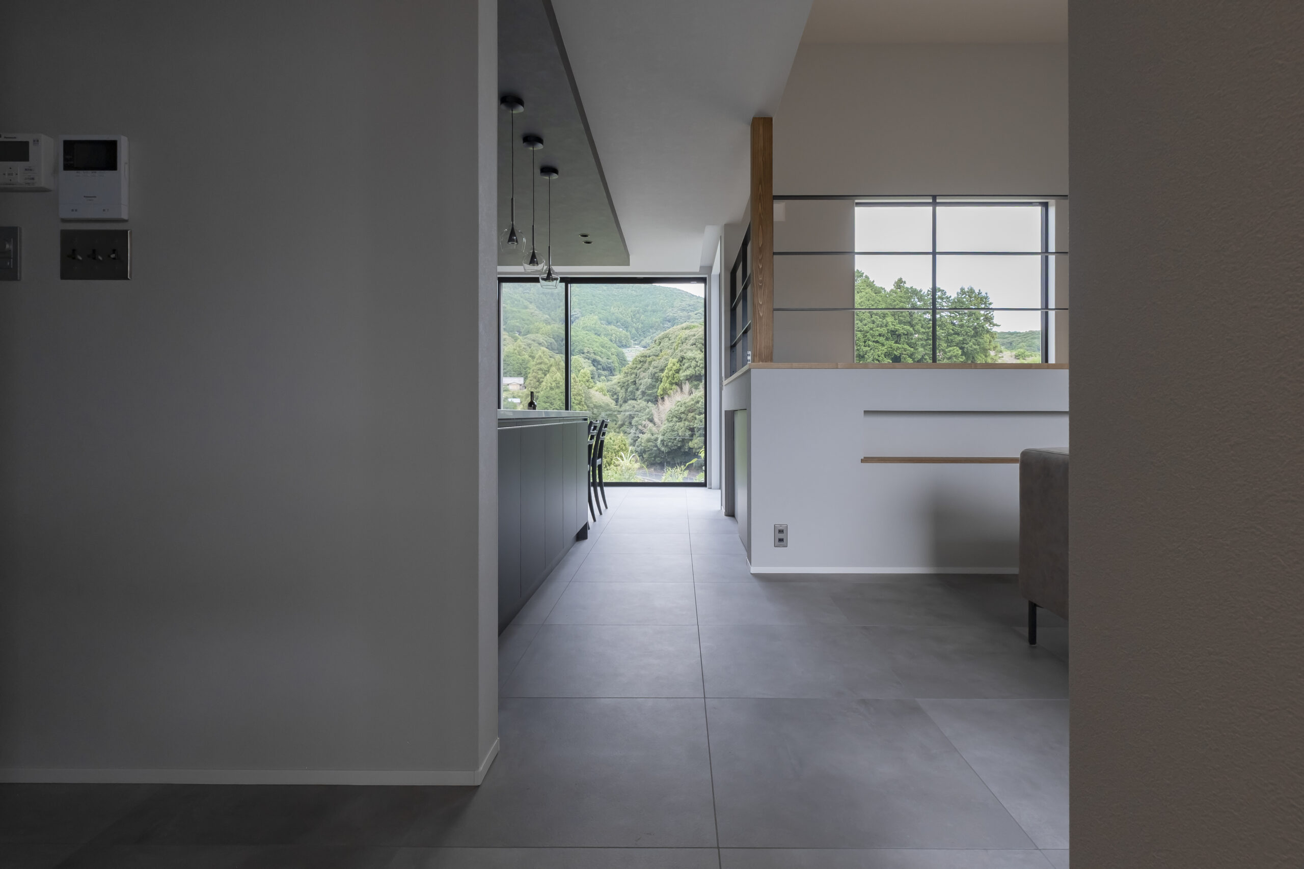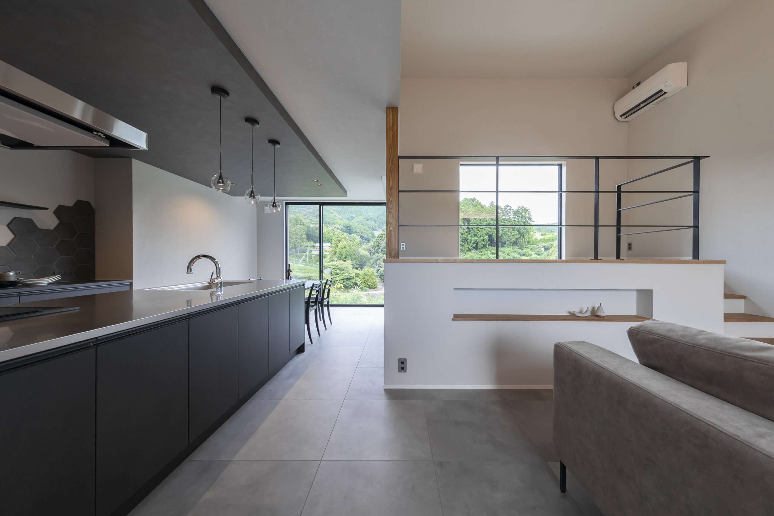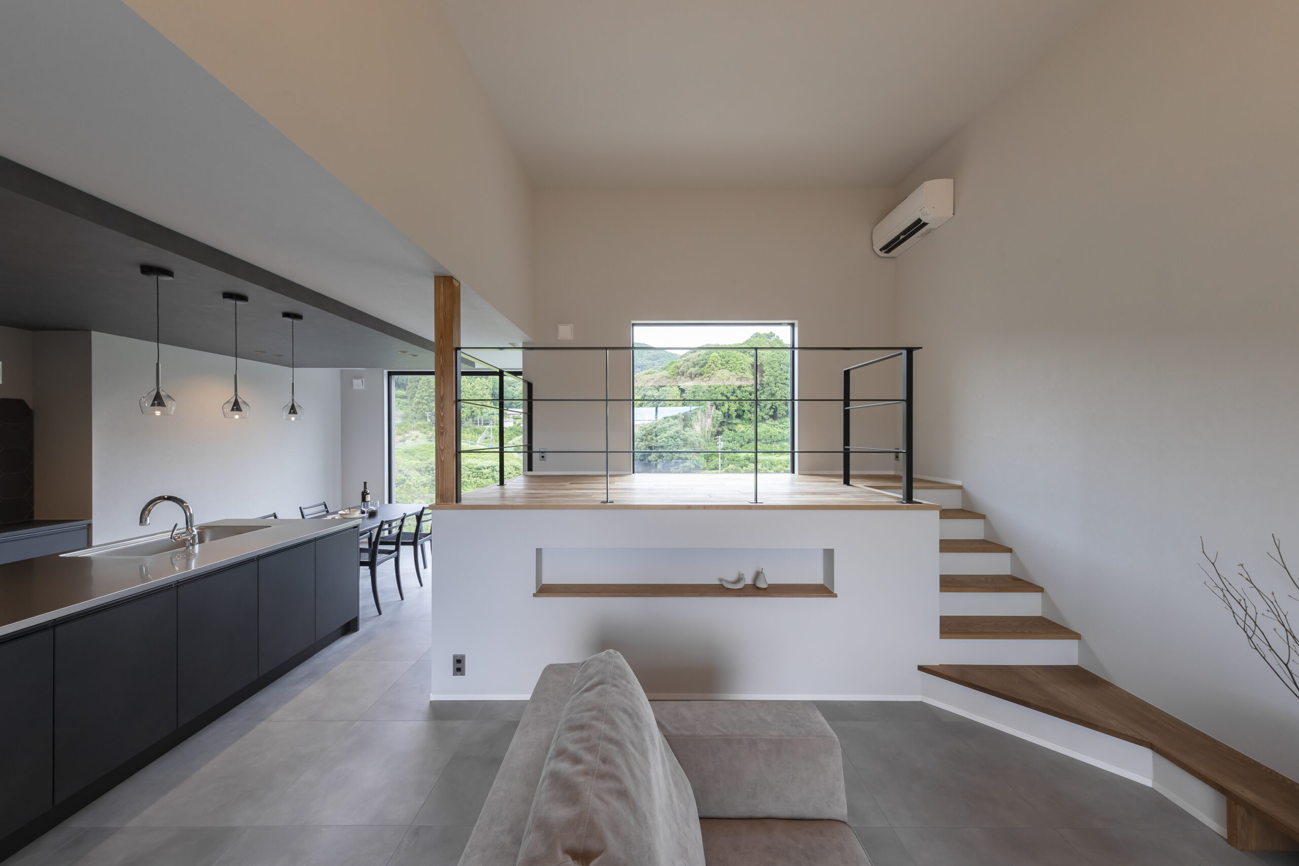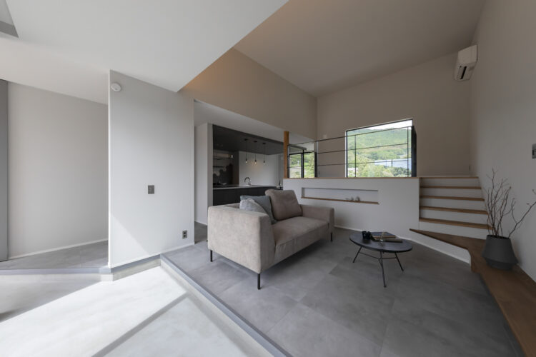 室内に足を踏み入れると、スキップフロアを取り込んだ多層的なLDKが広がります。