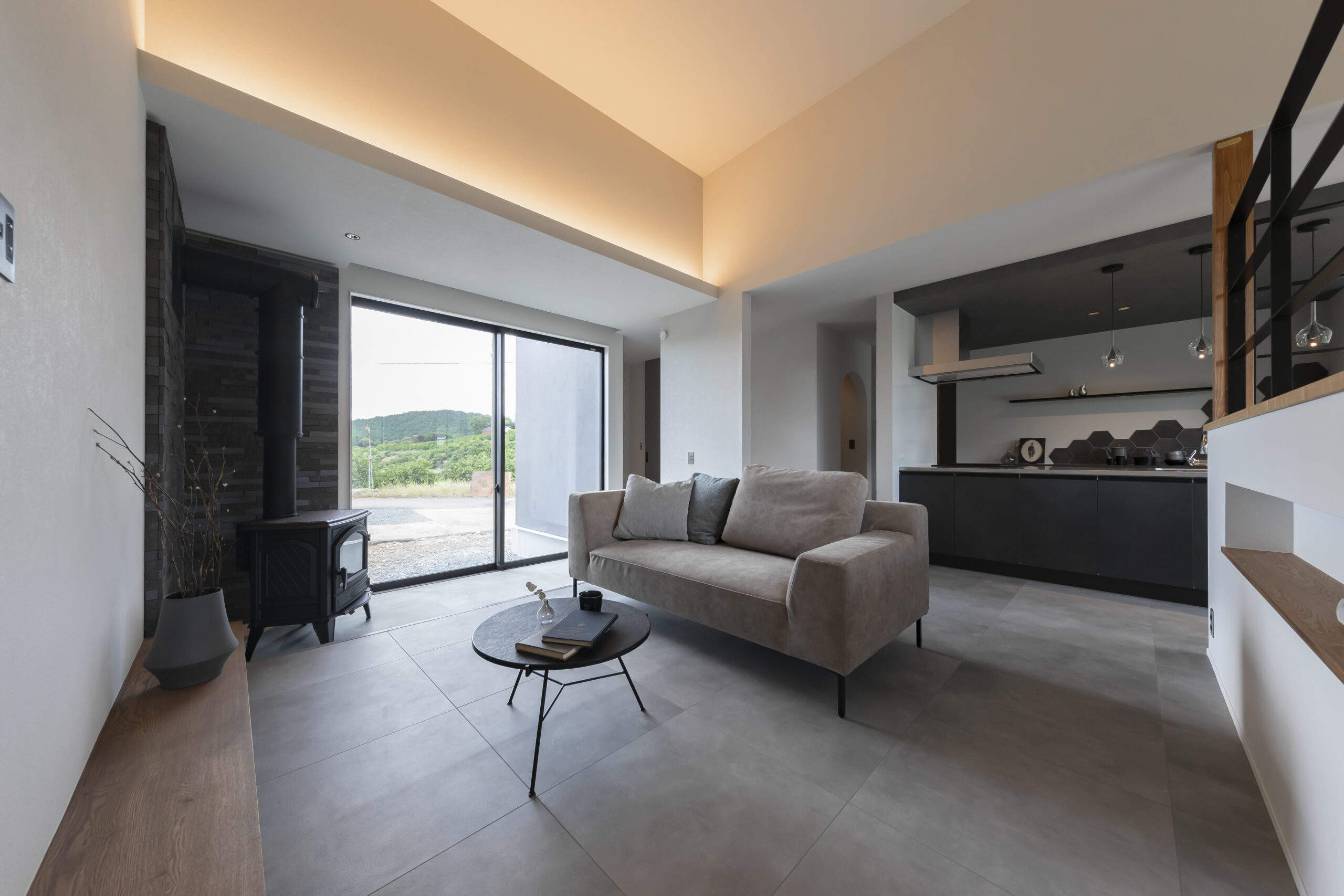絶景と暮らす、土間リビング×薪ストーブの平屋