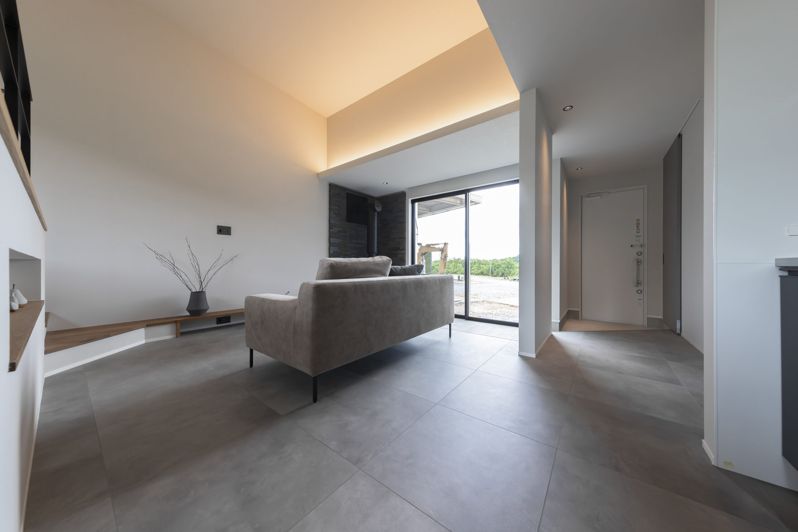 玄関からつながる土間には薪ストーブを据え、帰宅した瞬間にやわらかな暖かさが迎えるように設計されています。