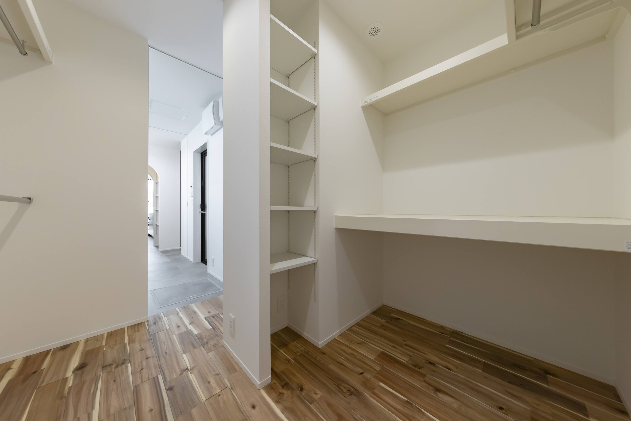 お客様は、玄関からLDKへとスムーズに導かれる「表動線」、家族は玄関からシューズクローク、そして広めに確保されたファミリークローゼットへと抜ける裏動線へ。この裏動線によって、帰宅後の靴や上着、荷物をスムーズに収納できるため、生活感を表に出さず、常に整った玄関でお客様を迎えることができます。