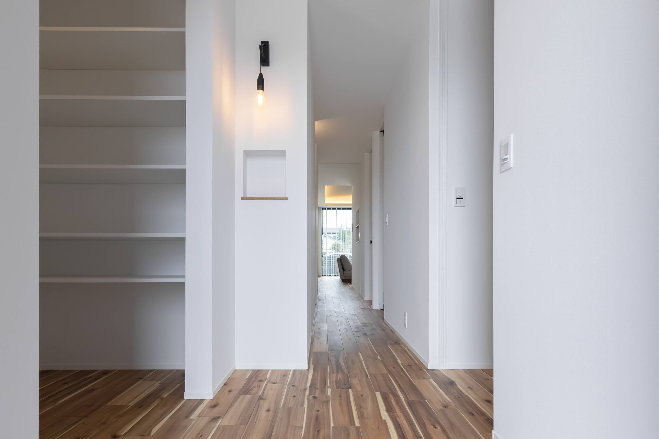 玄関ドアを開けると、正面にはニッチを設けたウェルカムスペースが広がります。特徴的なのは、家族と来客の動線を明確に分けた設計。