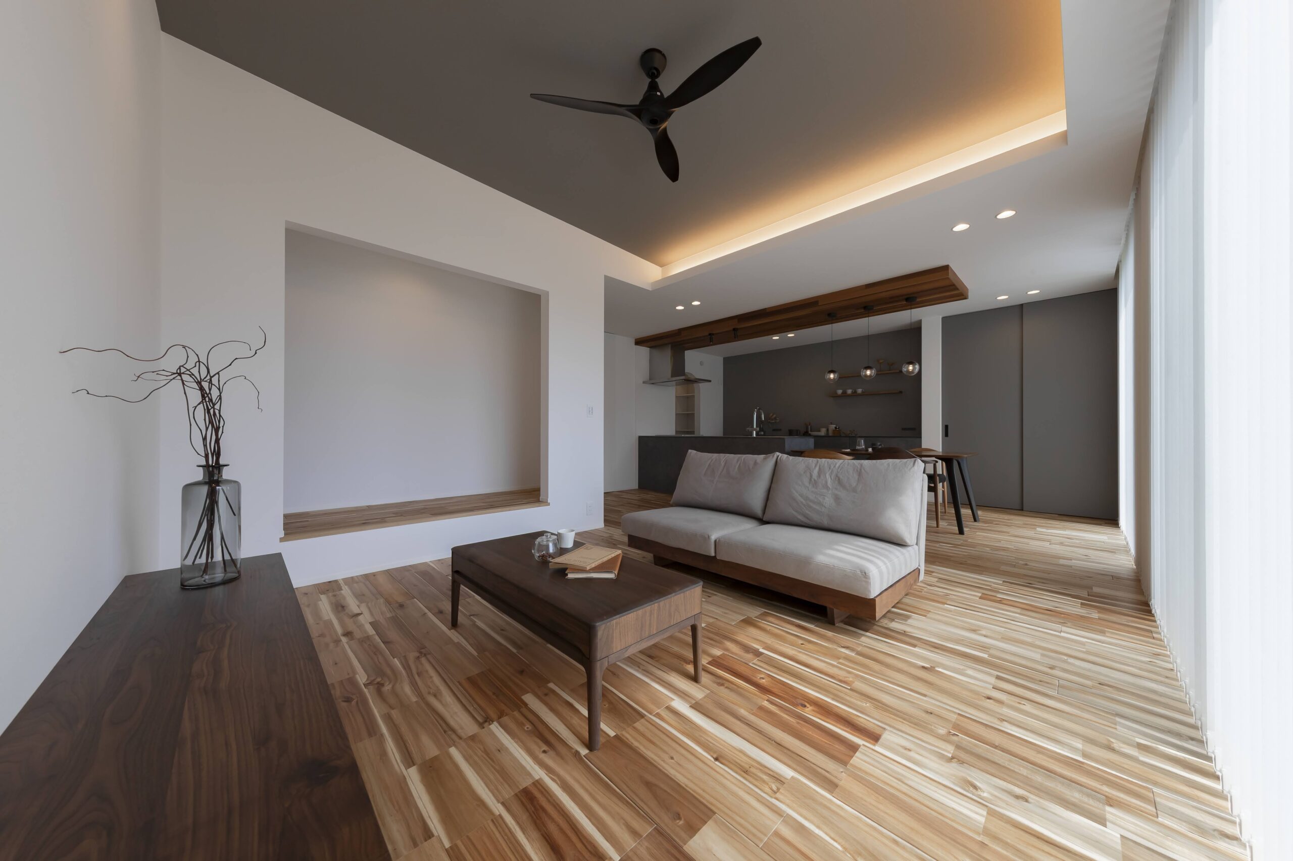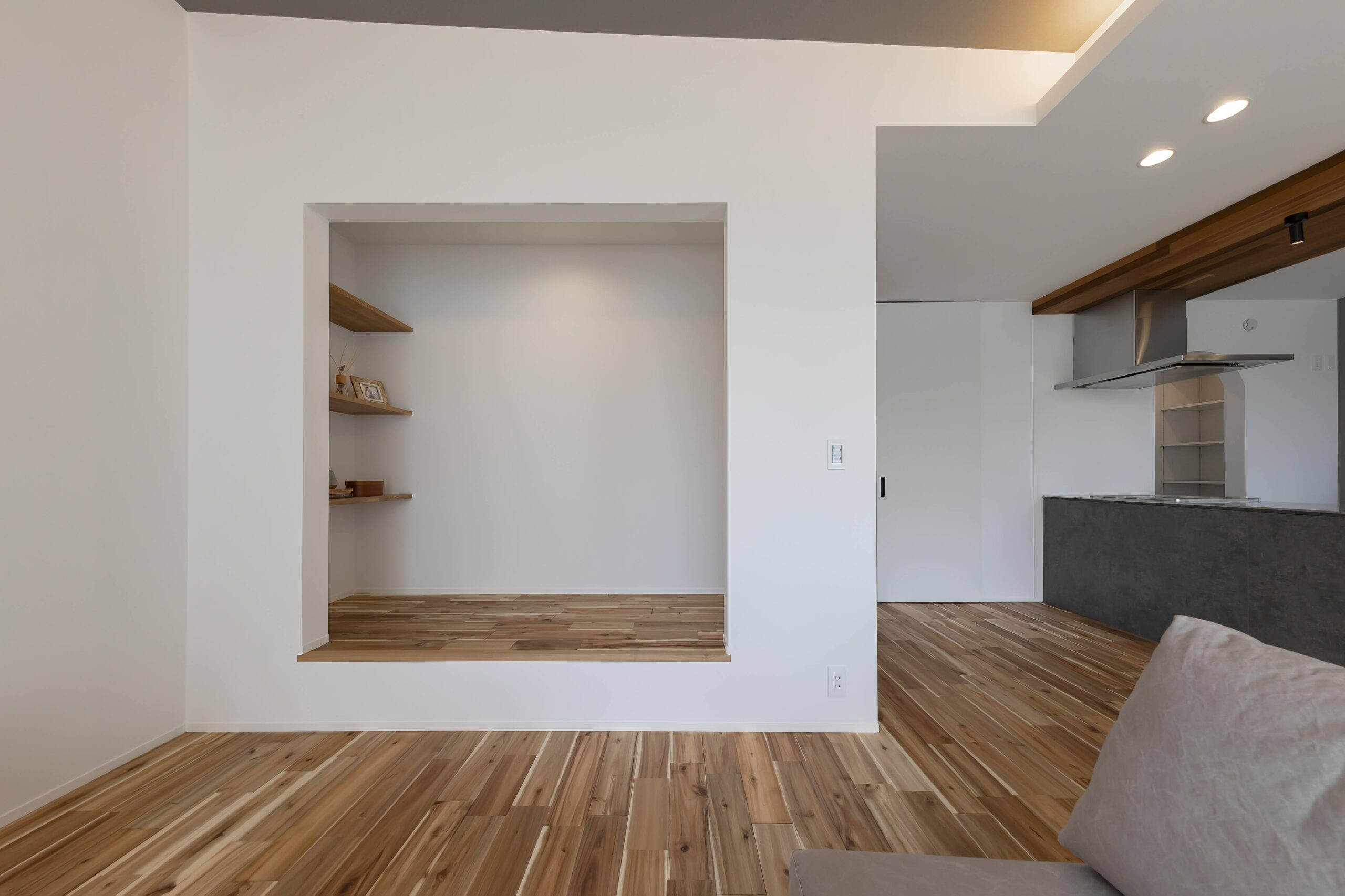 リビングの一角には、和室の代わりに3帖ほどのヌックを配置。開放的なLDKの中で、程よい籠り感のあるこの場所は、読書や休憩など、家族が思い思いにリラックスできるスペースです。