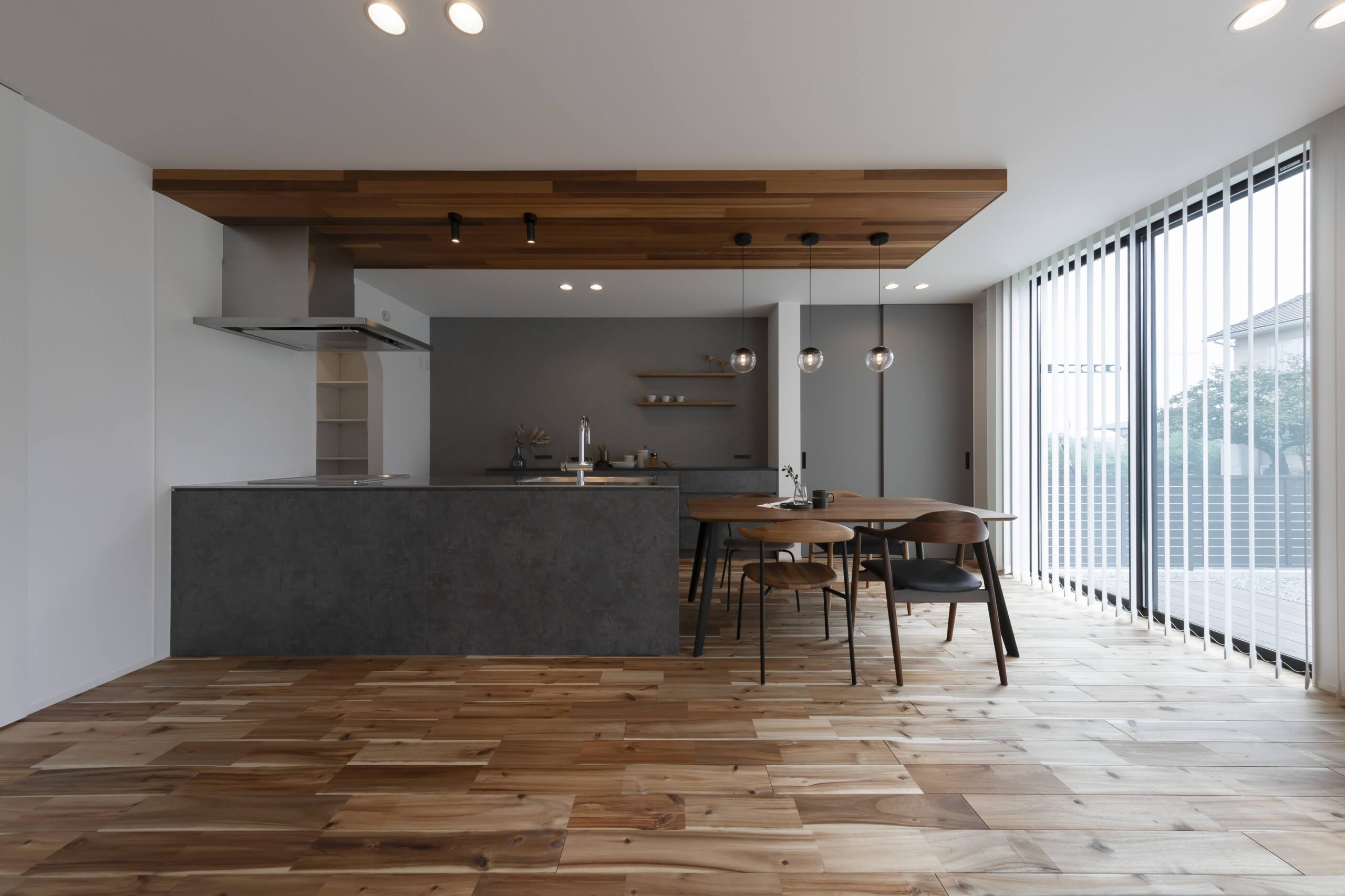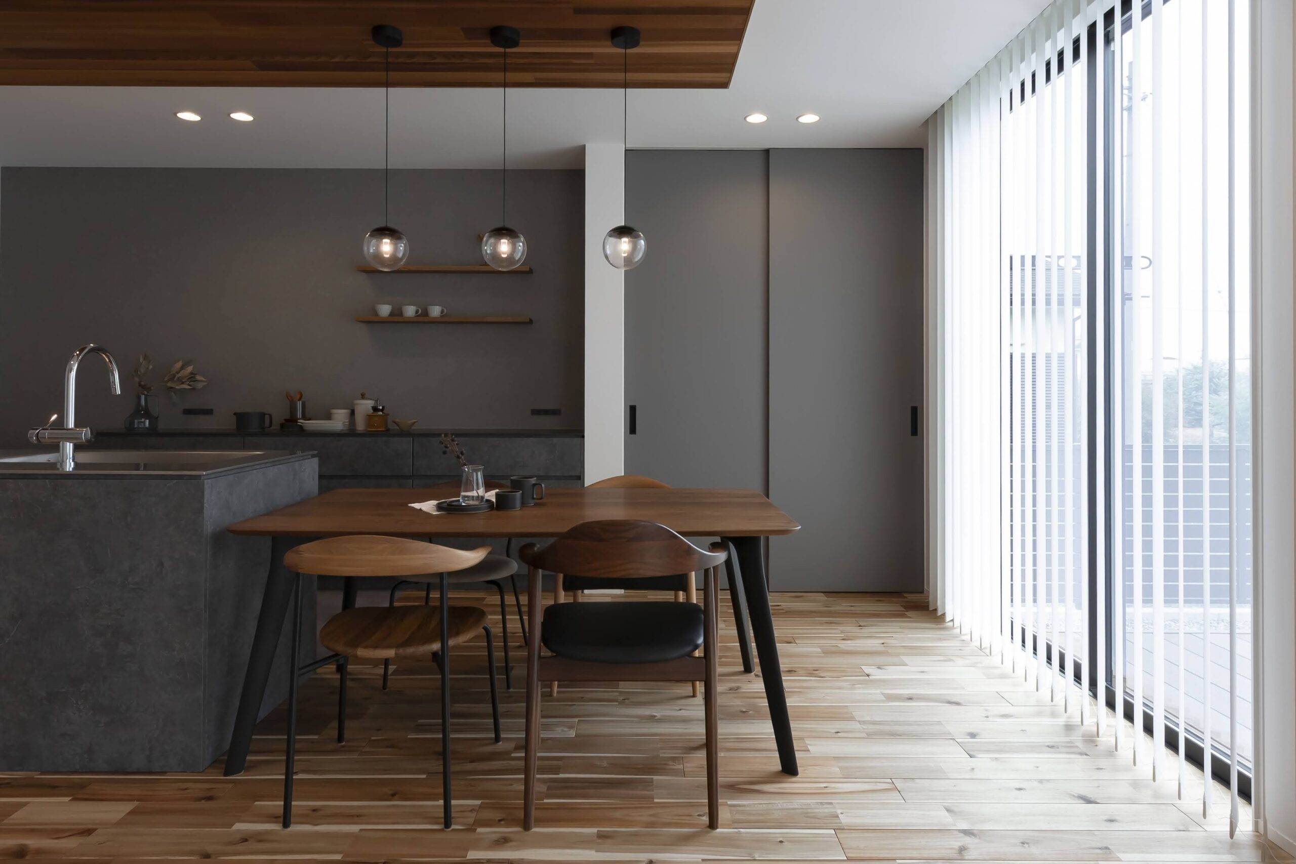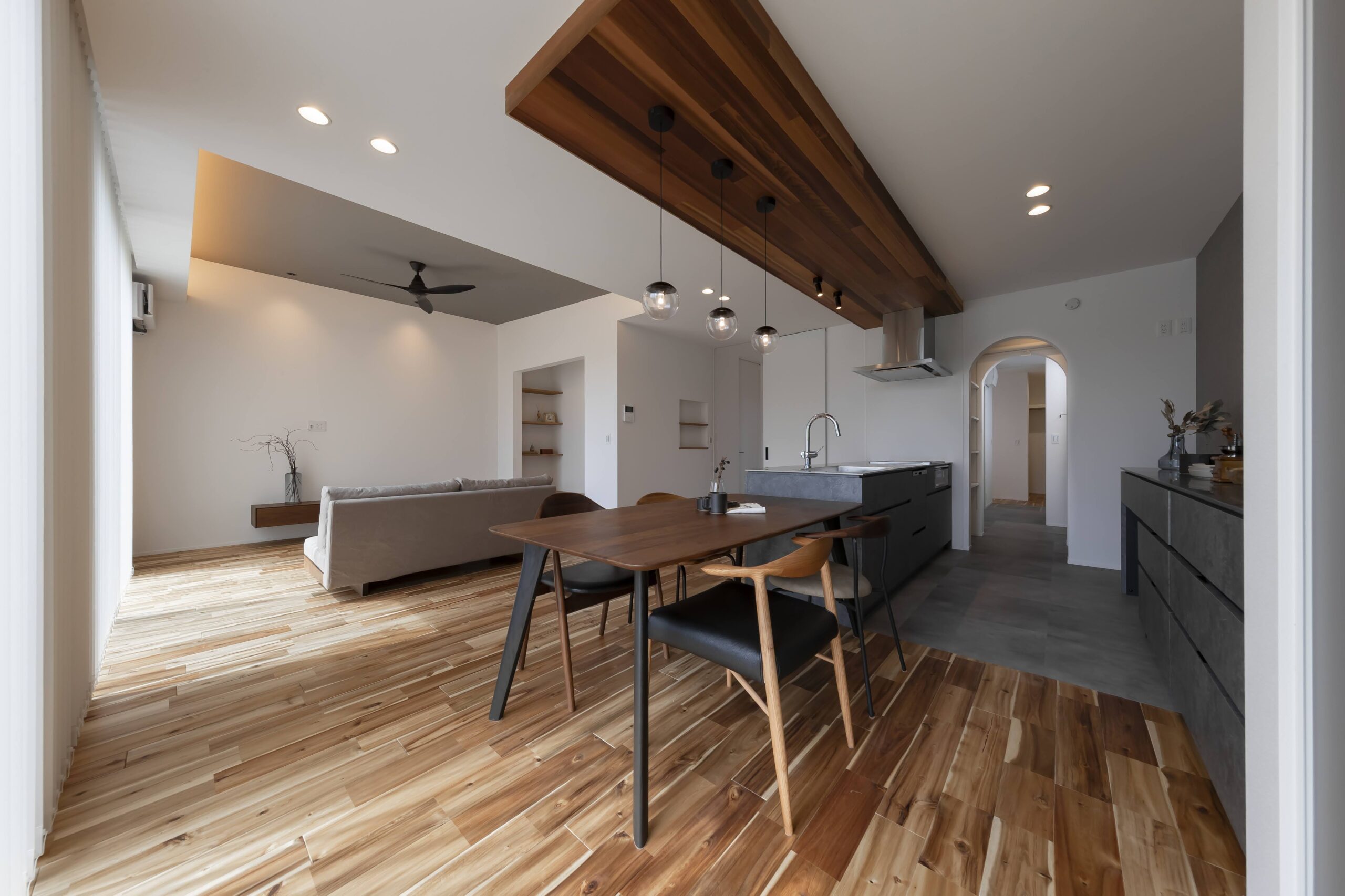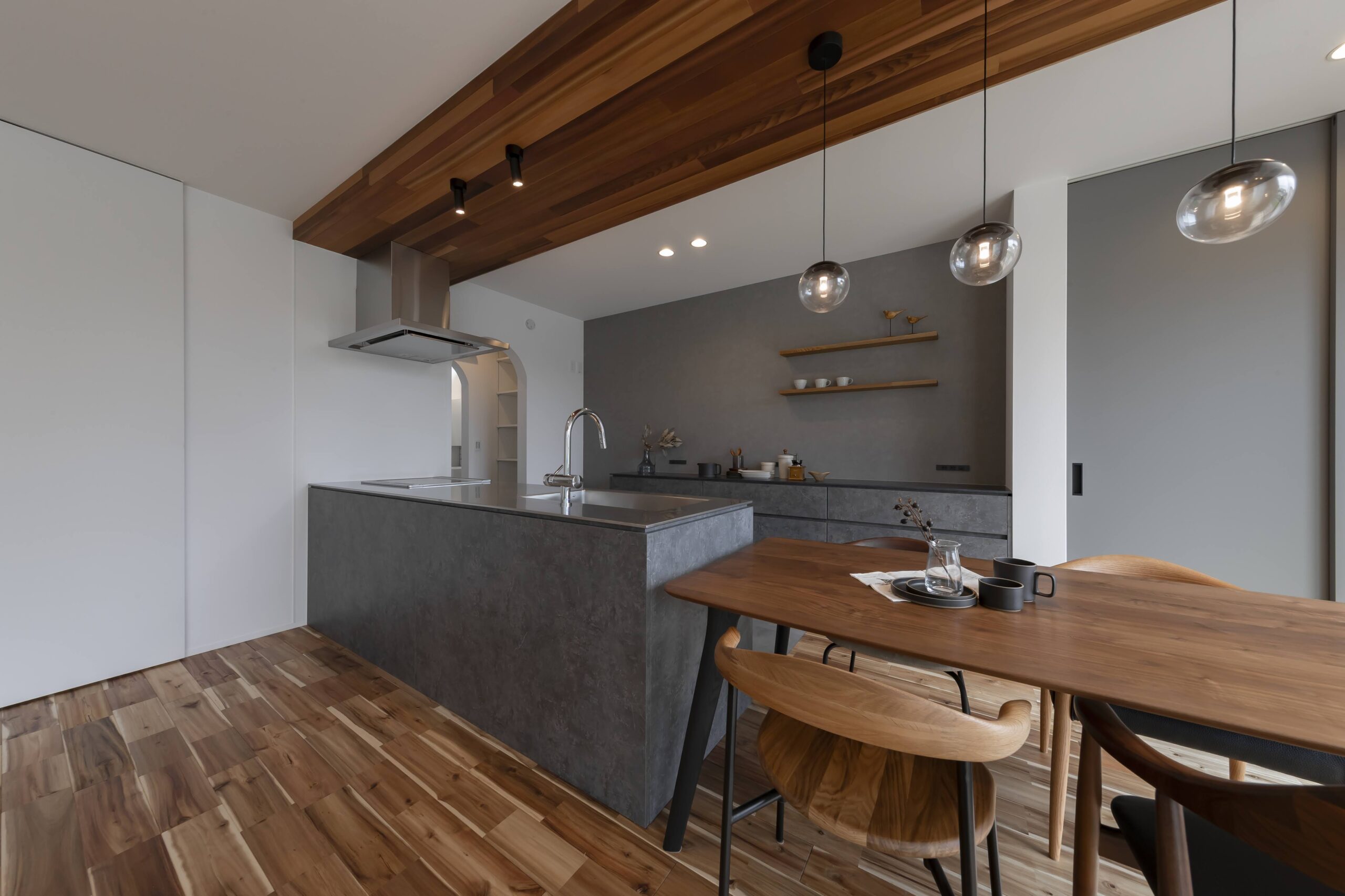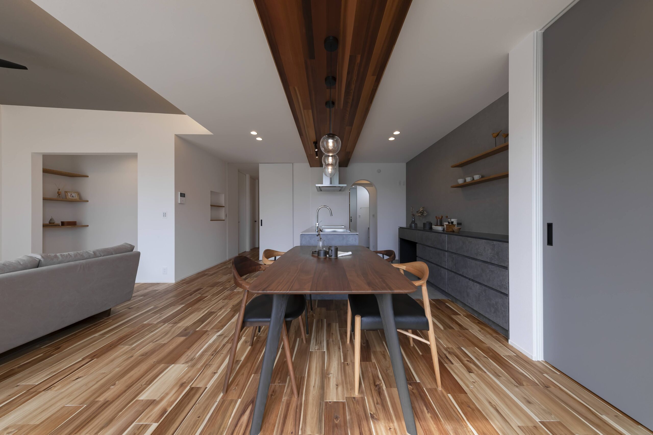 LDKは、この家の中心となる「集まれる場所」。勾配天井を採用することで視線が縦へと抜け、床面積以上の開放感を創出しました。
