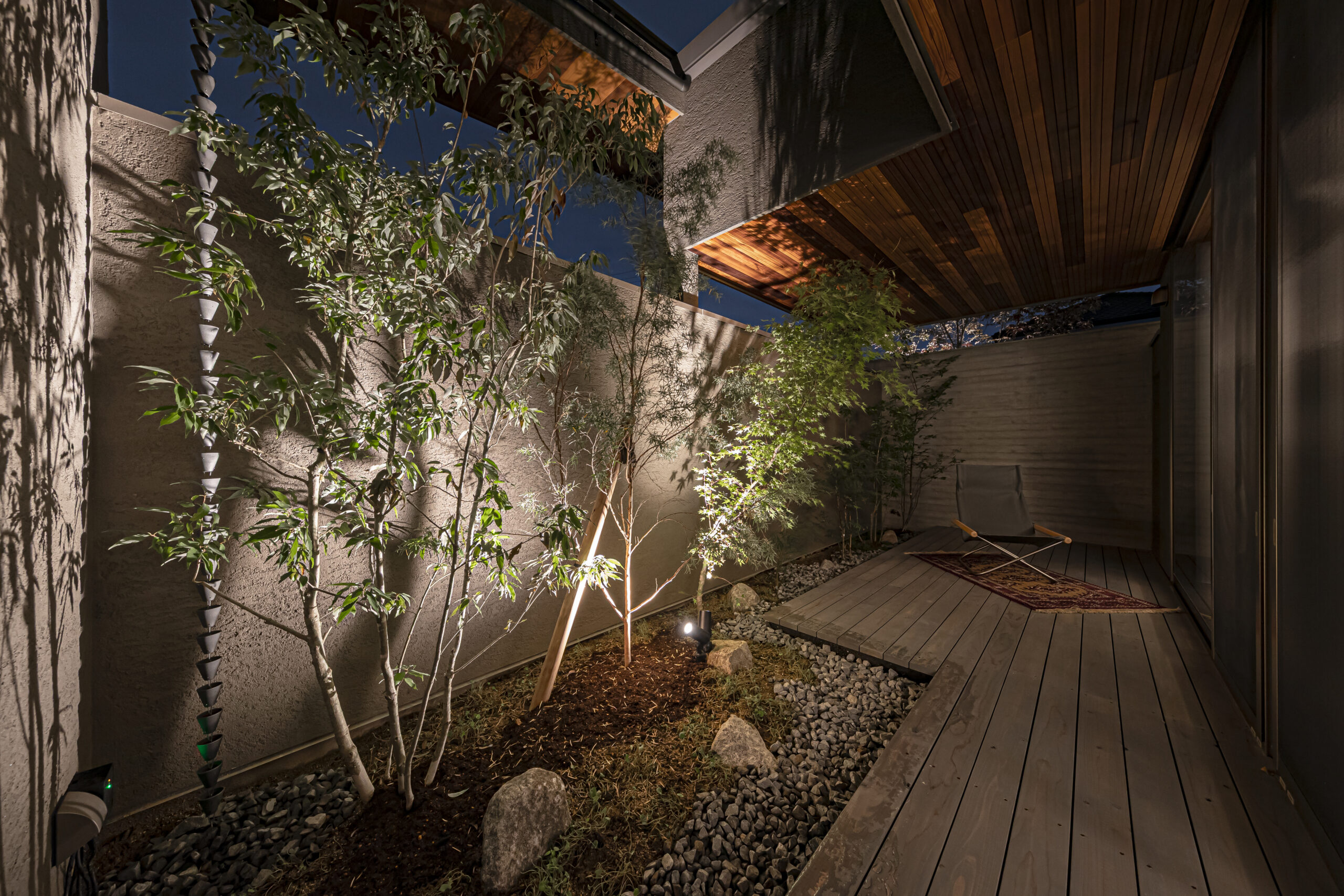 大谷石貼りやウッドデッキに、植栽と石が美しく調和する坪庭。