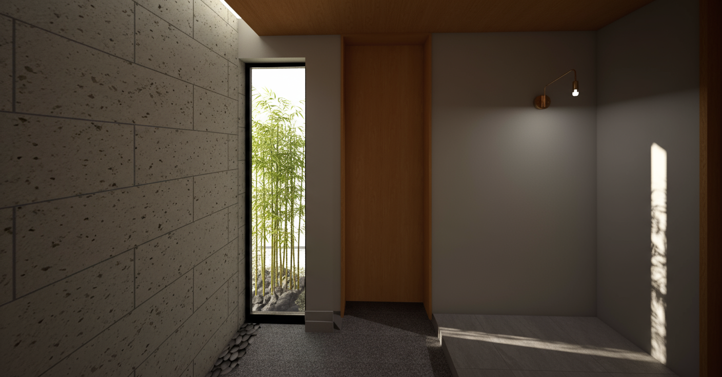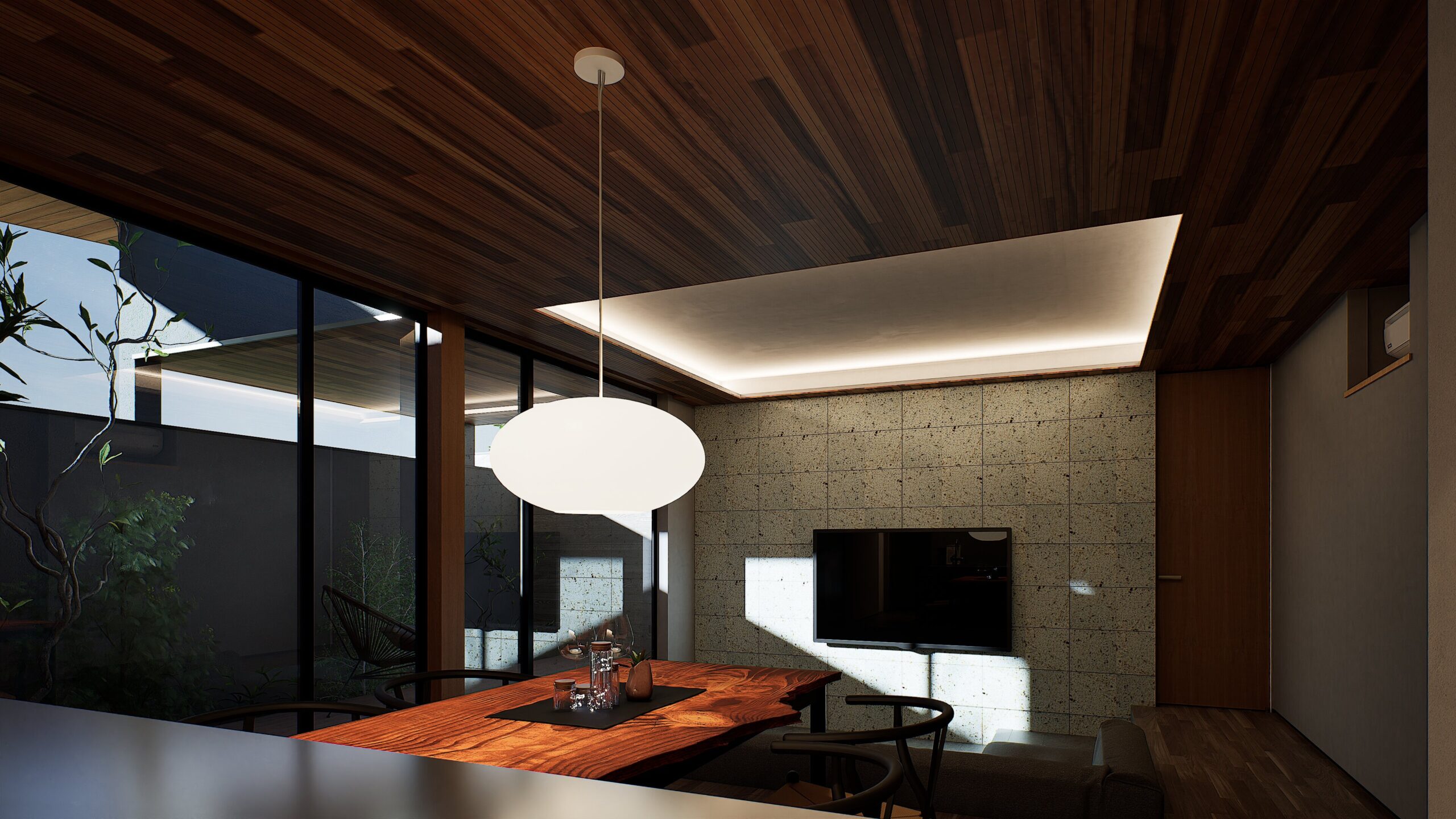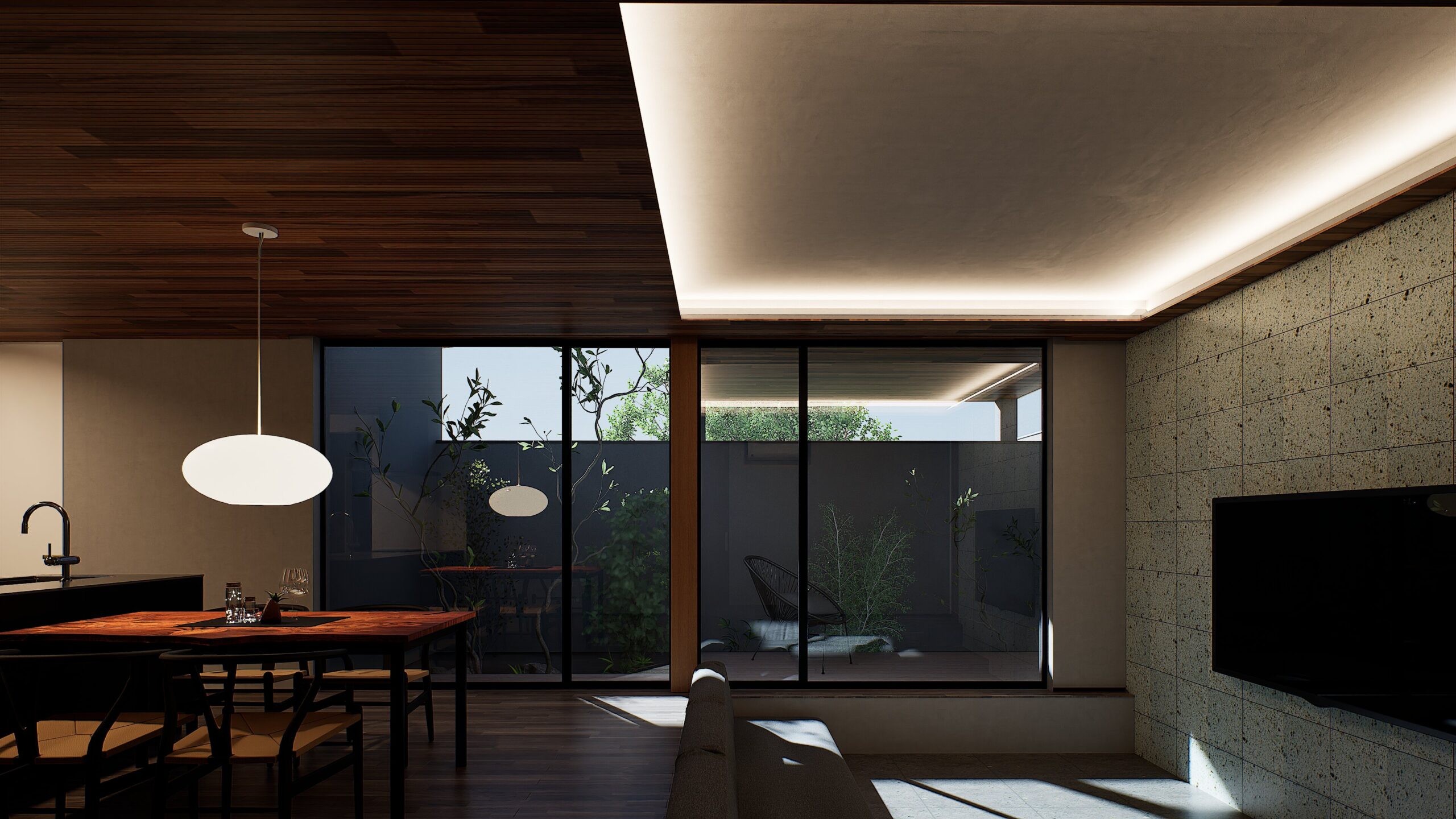 住まいの中心に配置された中庭が、リビング・ダイニング・主寝室・水回りをゆるやかにつなぎます。