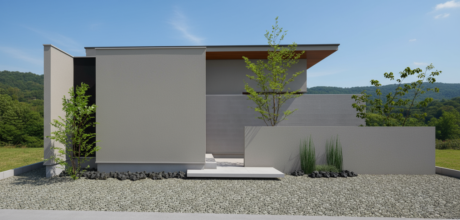 屋根には落ち着きのあるペールゴールドのガルバリウム鋼板、外壁はトラバーチン仕上げの塗り壁を採用。躯体には杉板調のモルタル仕上げを施し、立体感と陰影が美しく浮かび上がるよう設計されています。