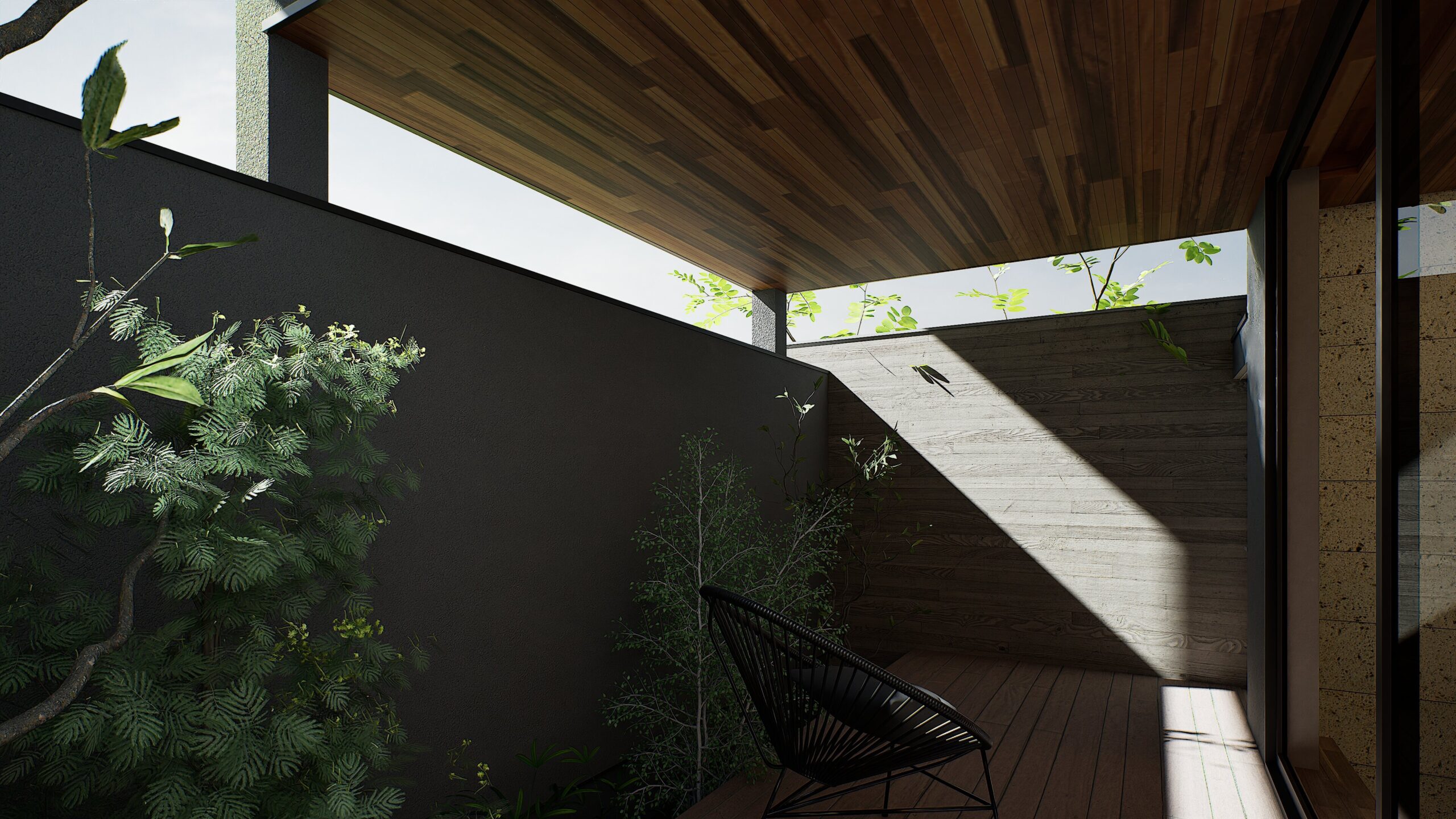 大谷石貼りやウッドデッキに、植栽と石が美しく調和する坪庭。