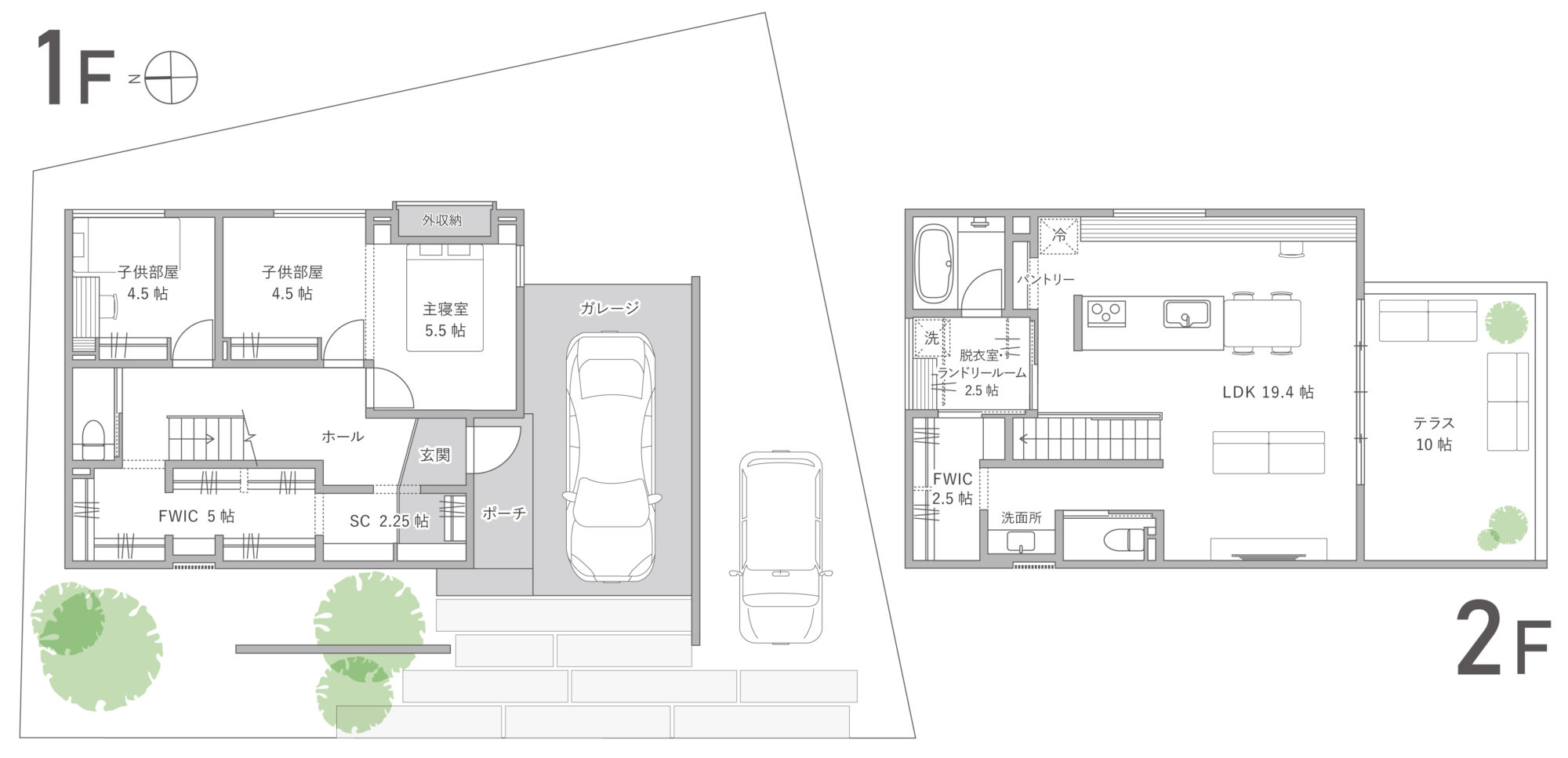 1階にガレージと居室をまとめることで、2階には19帖の広々LDKと、約10帖の屋外テラスを実現。
