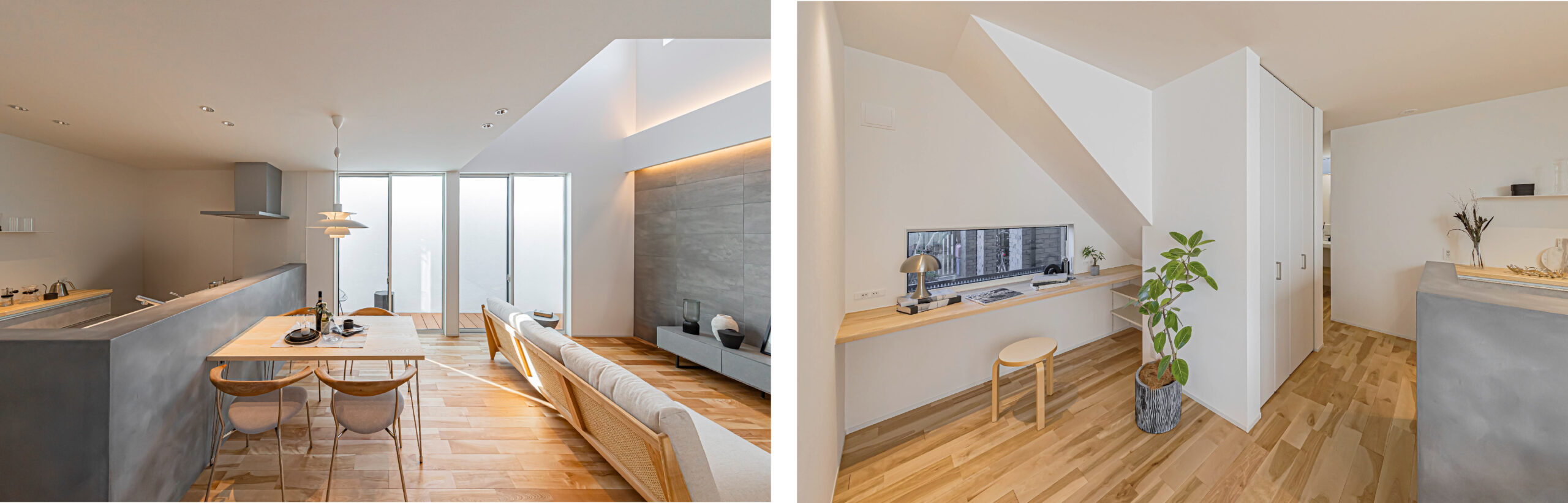 勾配天井のLDKや、リビングとつながる土間、その先に続く屋外テラスなど、広がるような空間設計が特徴。
