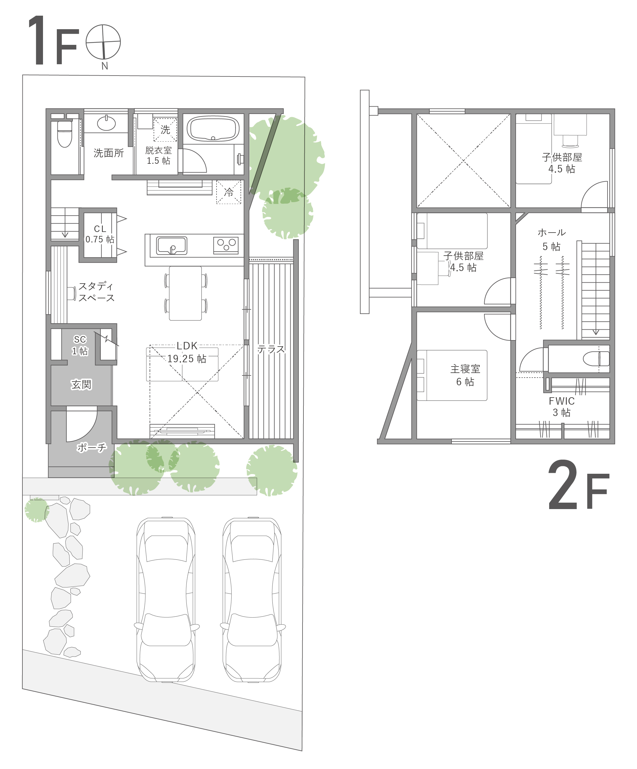 1階にガレージと居室をまとめることで、2階には19帖の広々LDKと、約10帖の屋外テラスを実現。