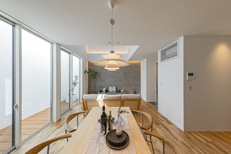 吹き抜けのリビングには陽光が降り注ぎ、誰からも見られないプライベートテラスが隣接。