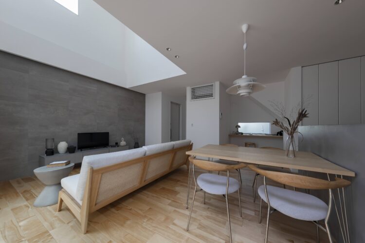 19帖のLDKは壁一面がタイル張りの贅沢な空間。吹き抜けが開放感を演出します。