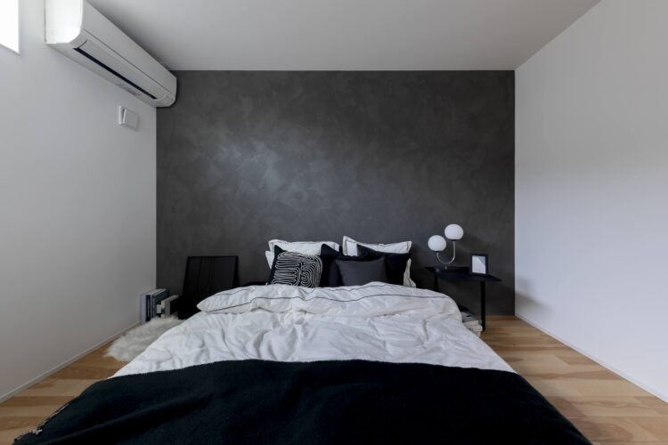 塗り壁のアクセントがおしゃれな主寝室は、シックでモダンな雰囲気に。