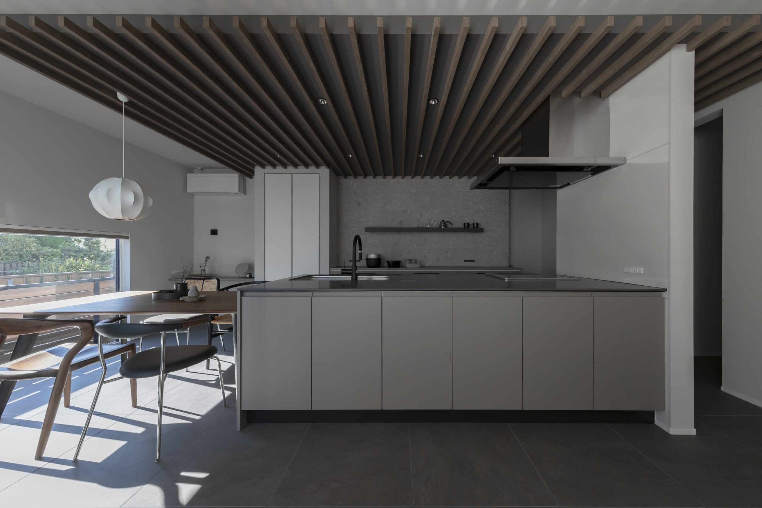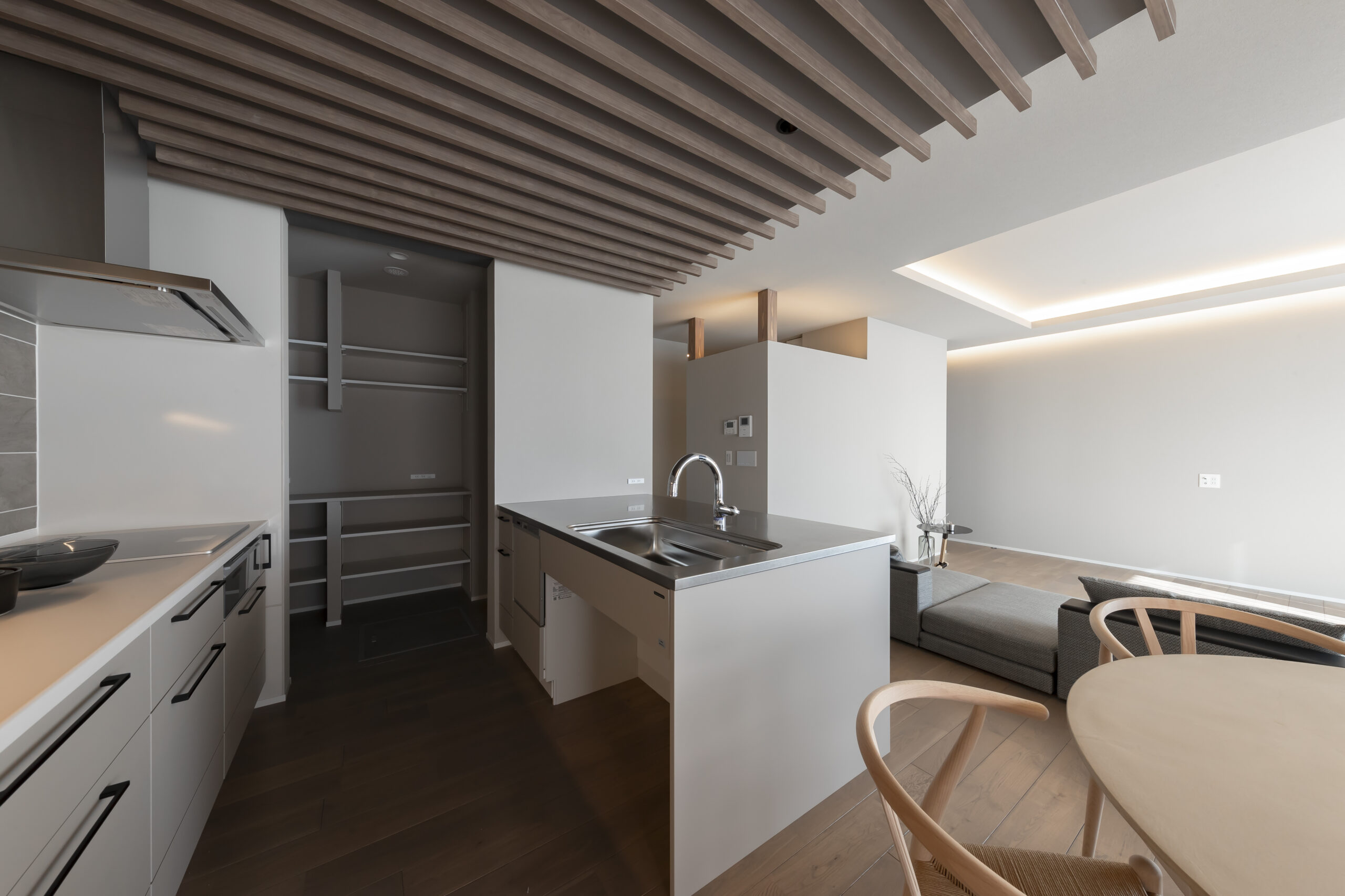 買い物帰りの重い荷物も、玄関からパントリーへそのまま収納。キッチン家電もすべてパントリー内に収めることで、生活感を徹底的に排除しつつ、調理効率を最大化しました。