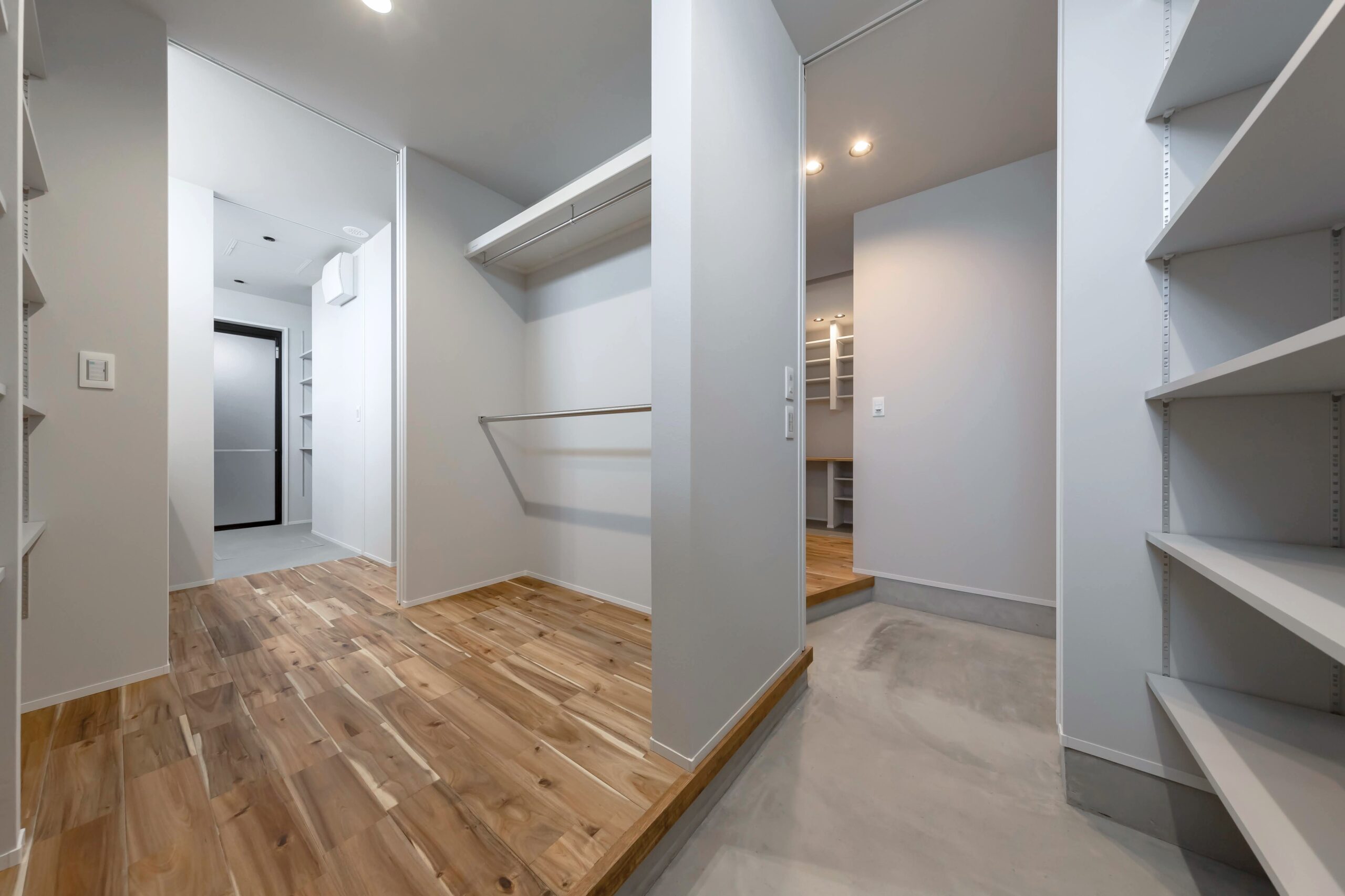 この家の最大の特徴は、玄関からリビングへと抜ける家族動線専用動線に設けられた「1階ファミリークローゼット」。