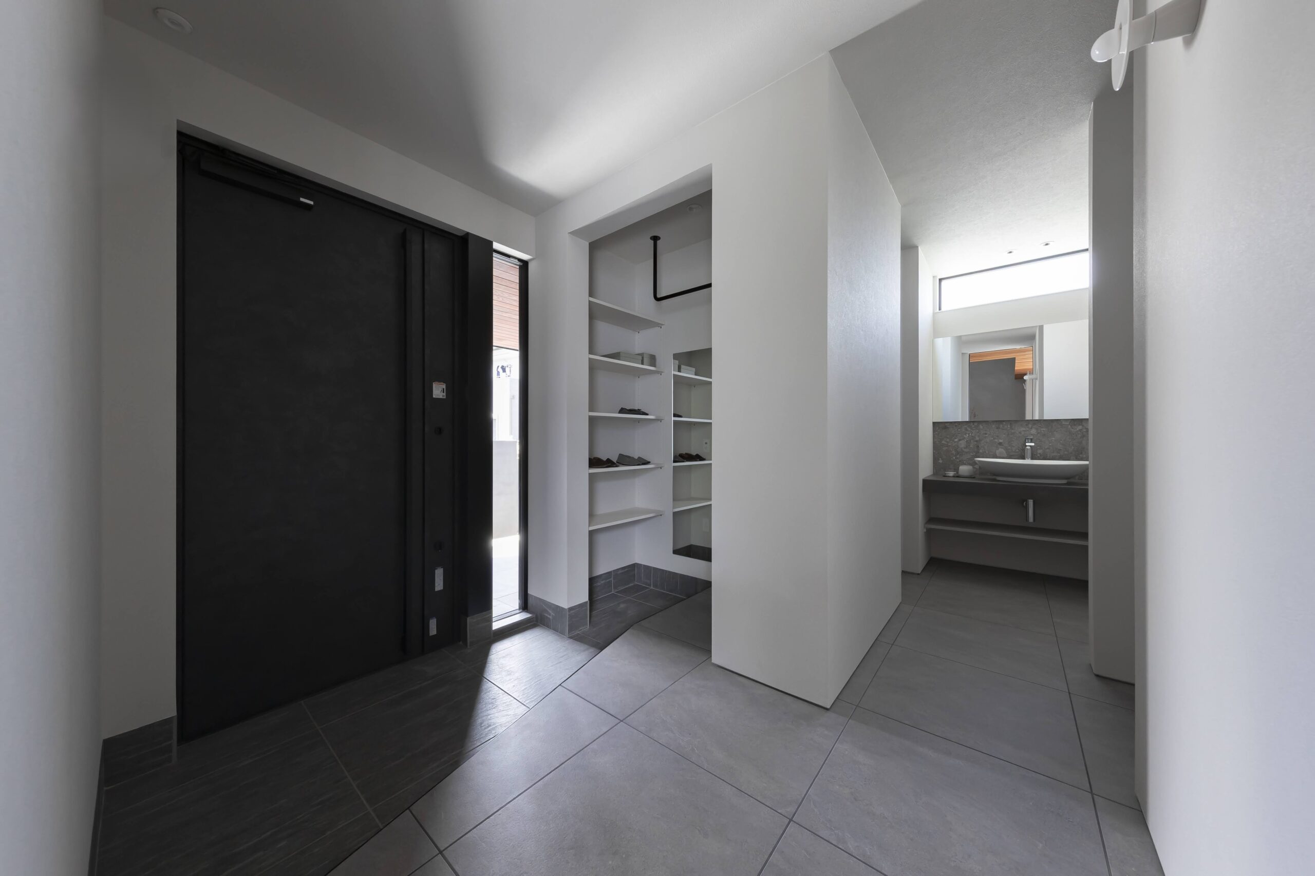 玄関を開けると、お客さまをお迎えする「表動線」と、家族用の「裏動線」が分かれています。裏動線上には、収納や水回りを集約。帰宅したら上着を脱いで、手を洗って着替えるまでの流れが歩きながら自然に完結します。