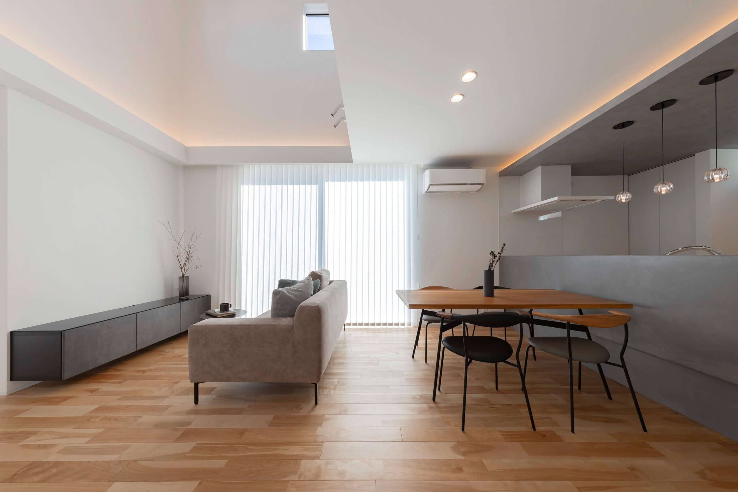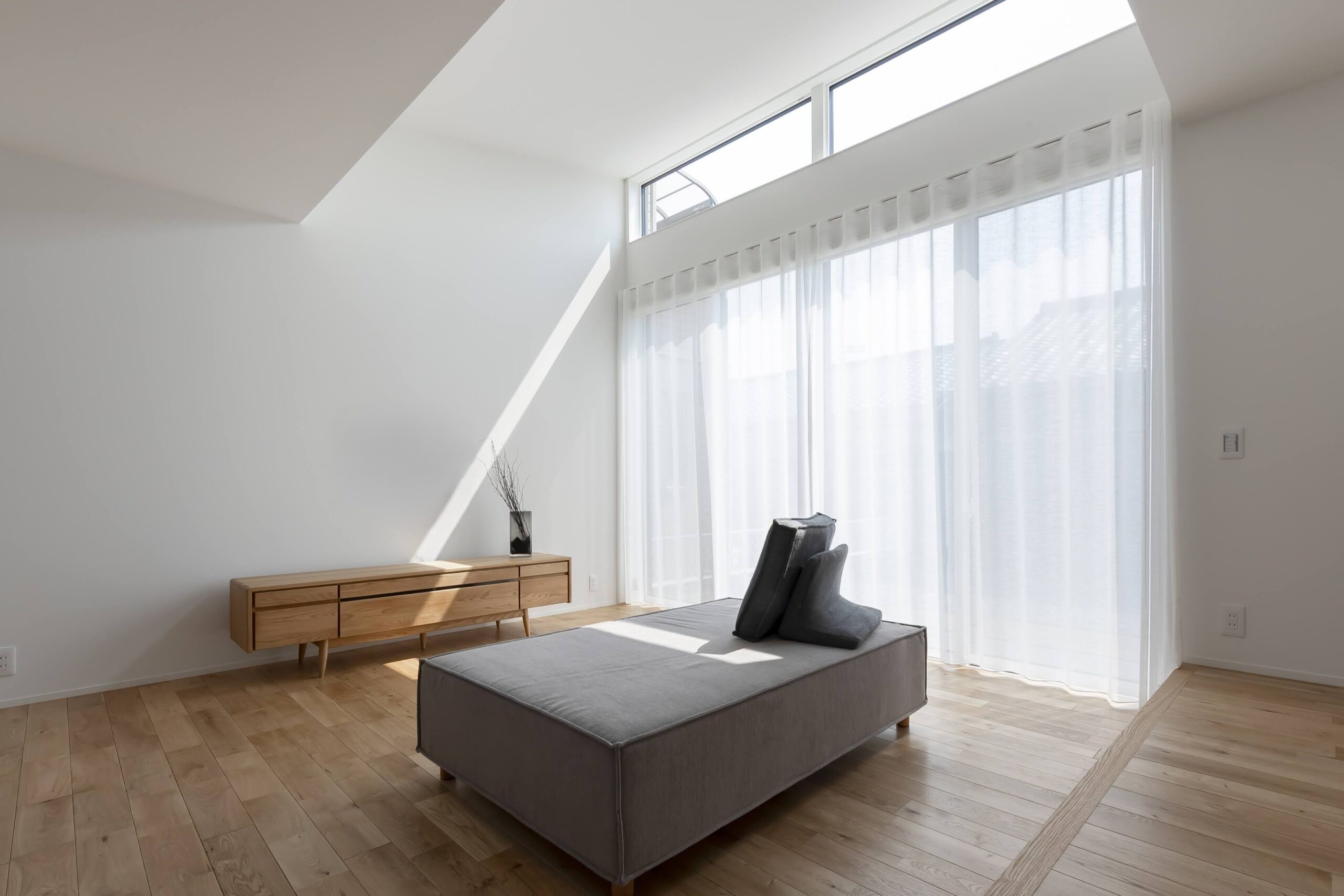メインの窓のカーテンを閉めている時でも、高窓からしっかりと明るい光が降り注ぐ、開放的で心地よいリビングを実現。