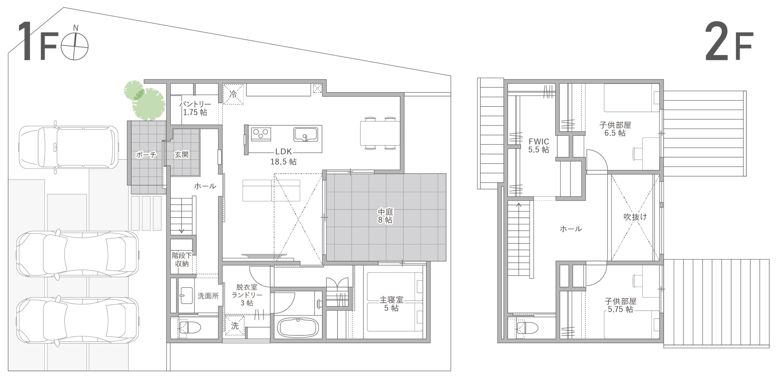 ワンフロアで生活が完結する人気の1階寝室を採用しつつ、LDKと距離をとることで夜の来客時の音問題を解消。