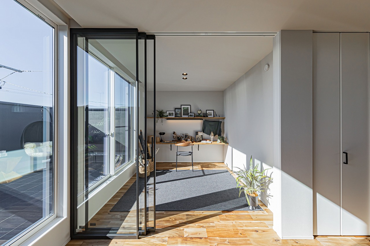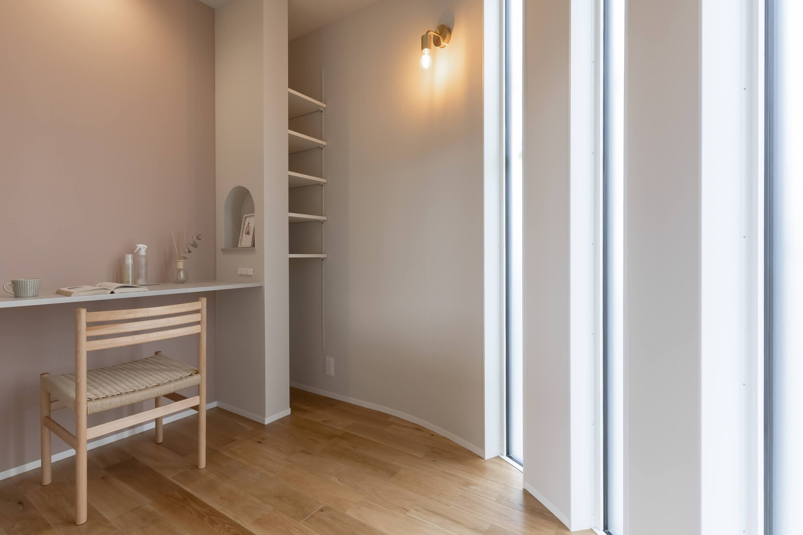 一方、奥様には編み物や読書を楽しめる落ち着いたお籠りスペースを用意しました。LDKからの動線や収納も工夫されているので、道具が散らからず、日常の中で自然に趣味を楽しめます。