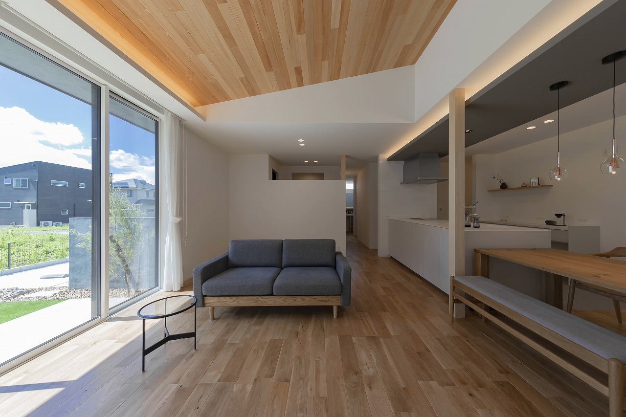 家の真ん中にあるリビングは、家族みんなが自然と集まる場所。どの部屋からも行き来しやすく、毎日の生活動線がスムーズになるように考えられています。