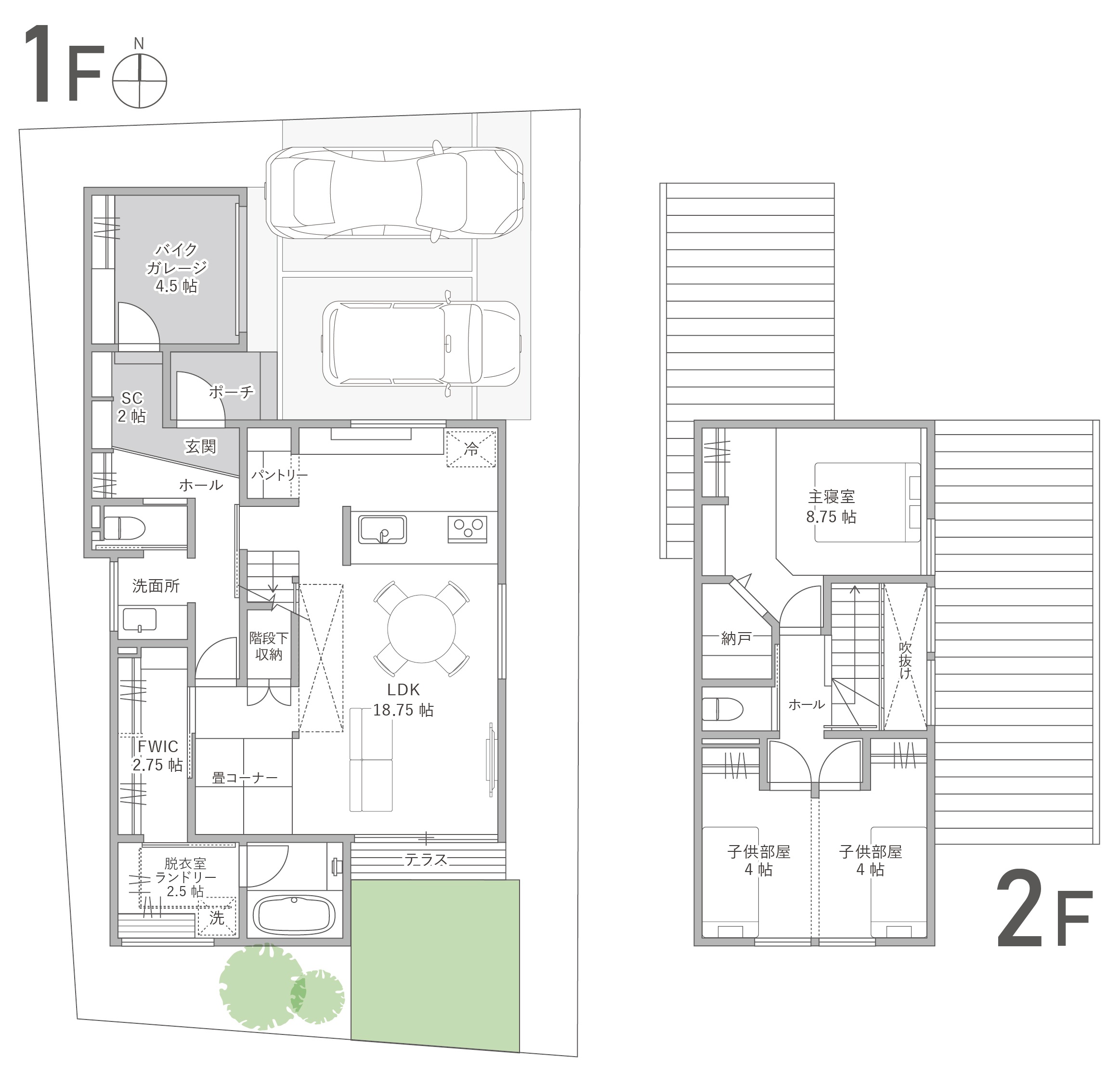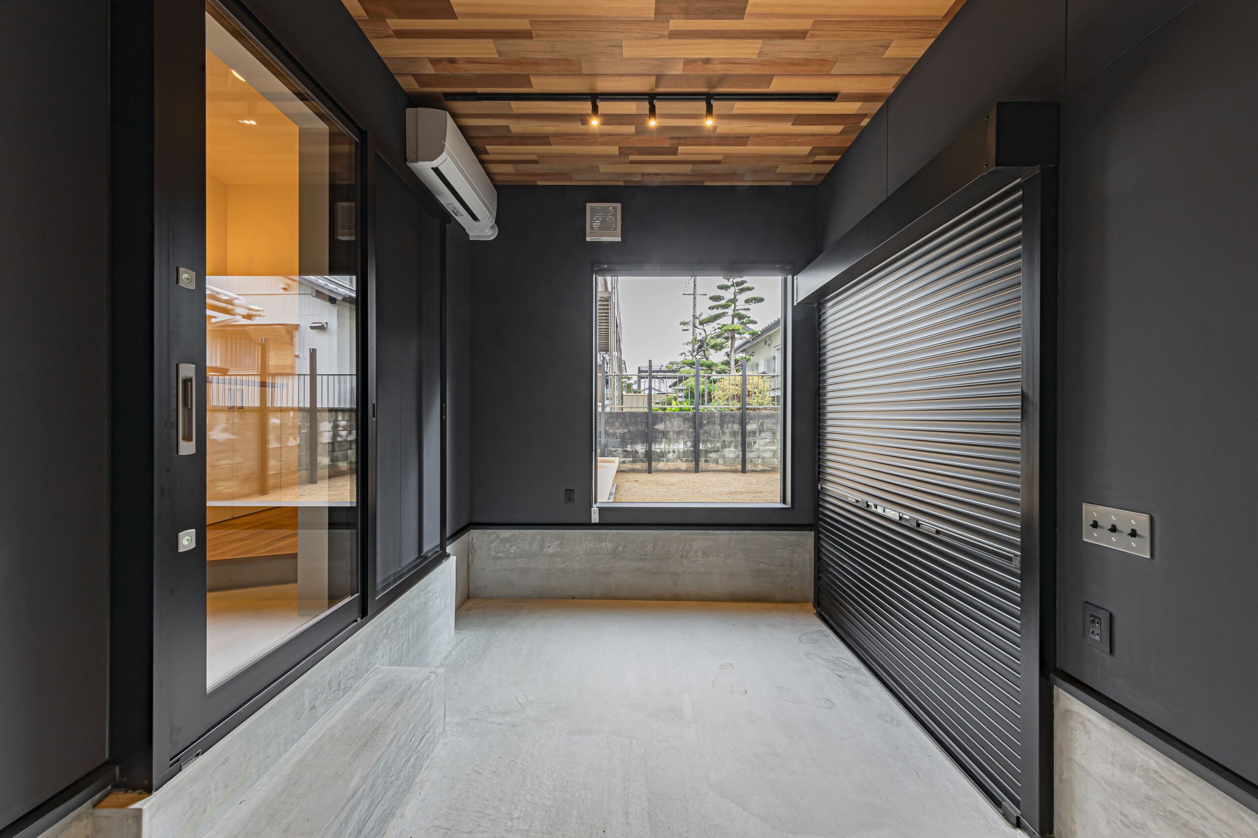 リビングを中心に、畳コーナーや庭がひとつながりになることで、広がりと心地よさを感じられる空間に。玄関とつながるバイクガレージは、趣味を楽しみながら、日々の動線もスムーズに整えています。限られた敷地の中で、暮らしやすさとデザイン性を両立した住まいです。