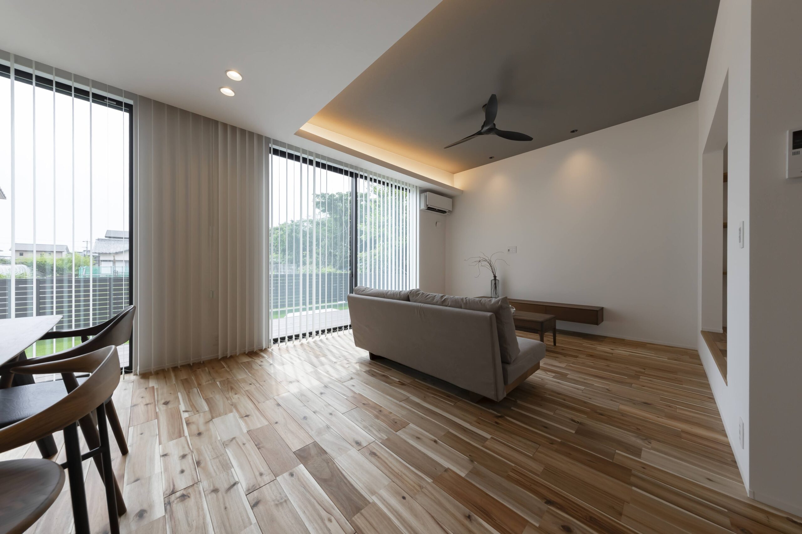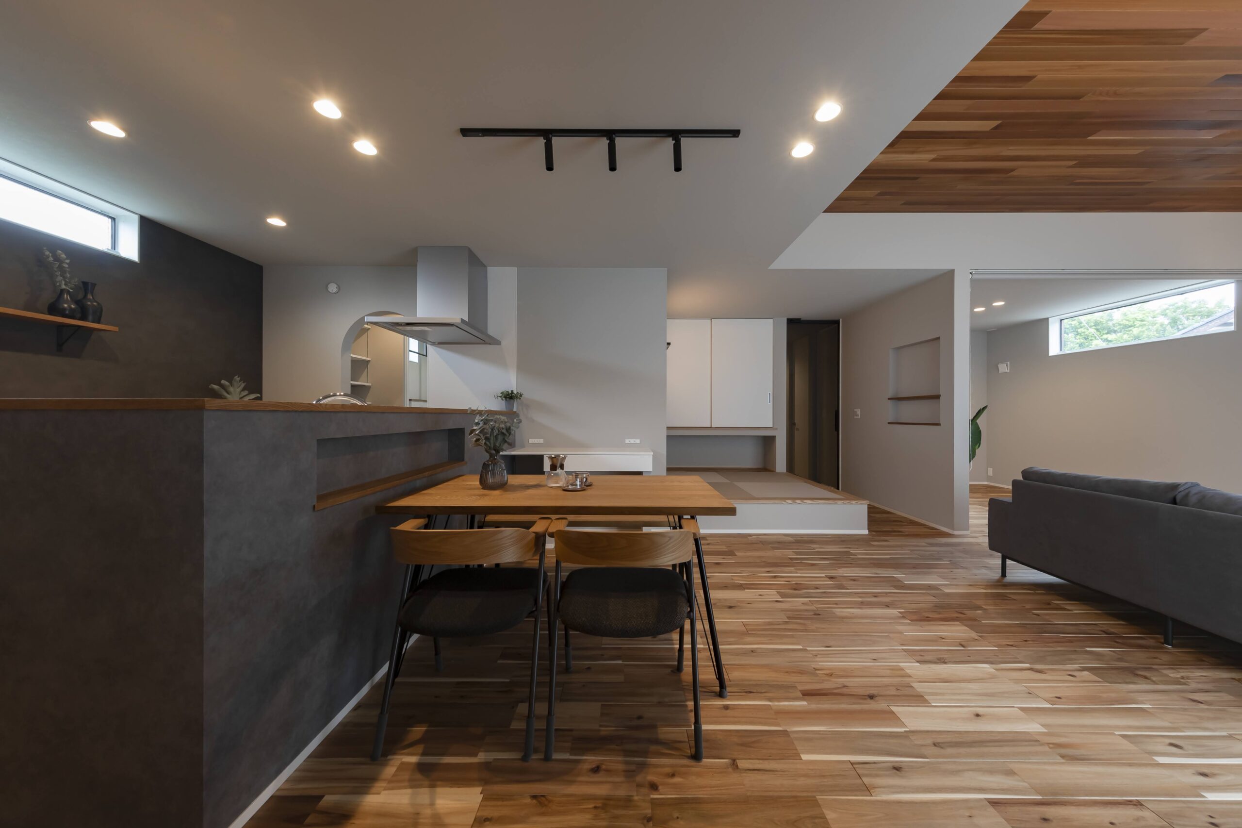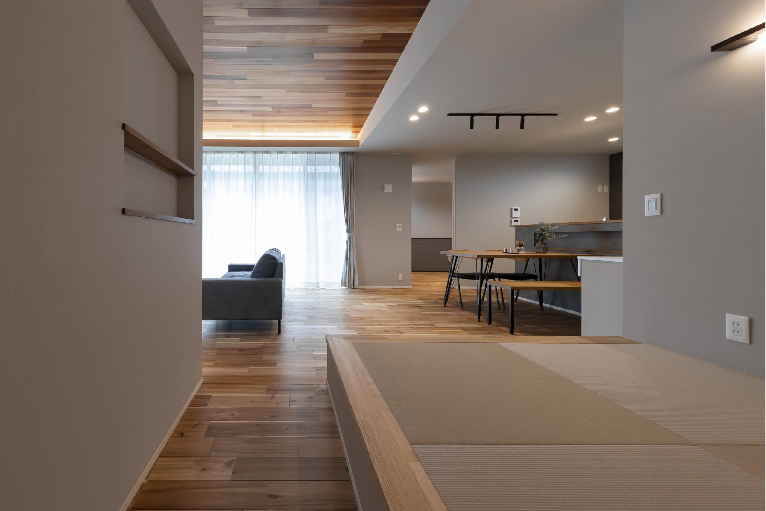 畳コーナーはお子さまの遊び場やお昼寝スペース、将来は寝室としても使える柔軟性のある居場所。日々の暮らしの中で、光と風、そして家族の気配を感じられるリビングです。