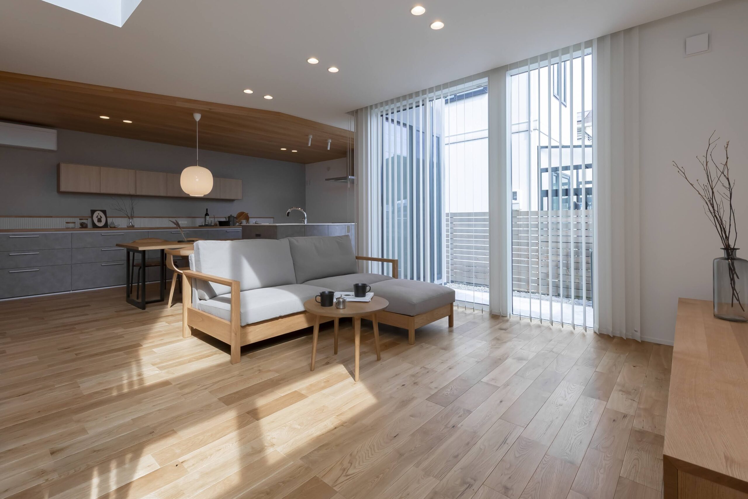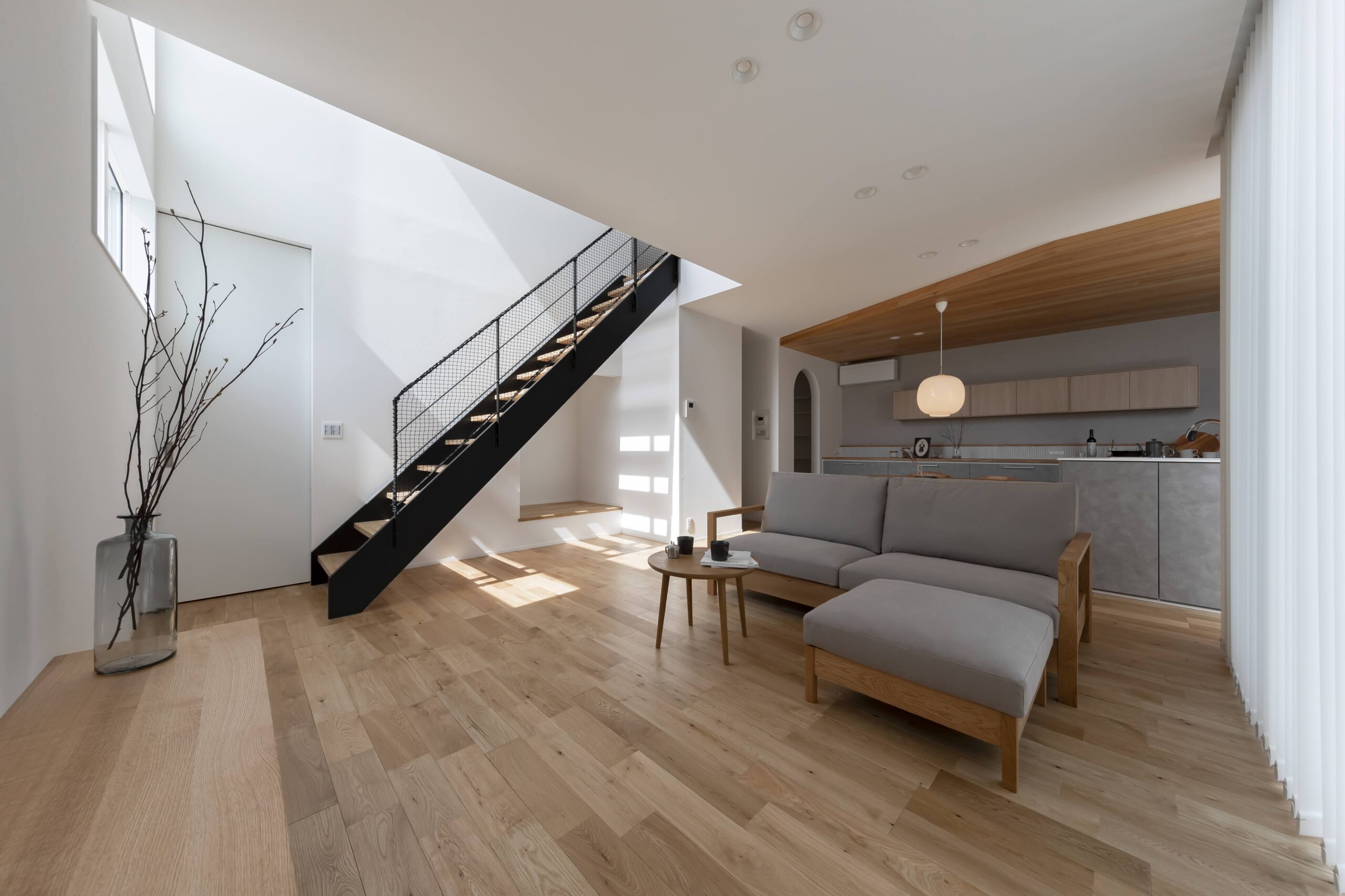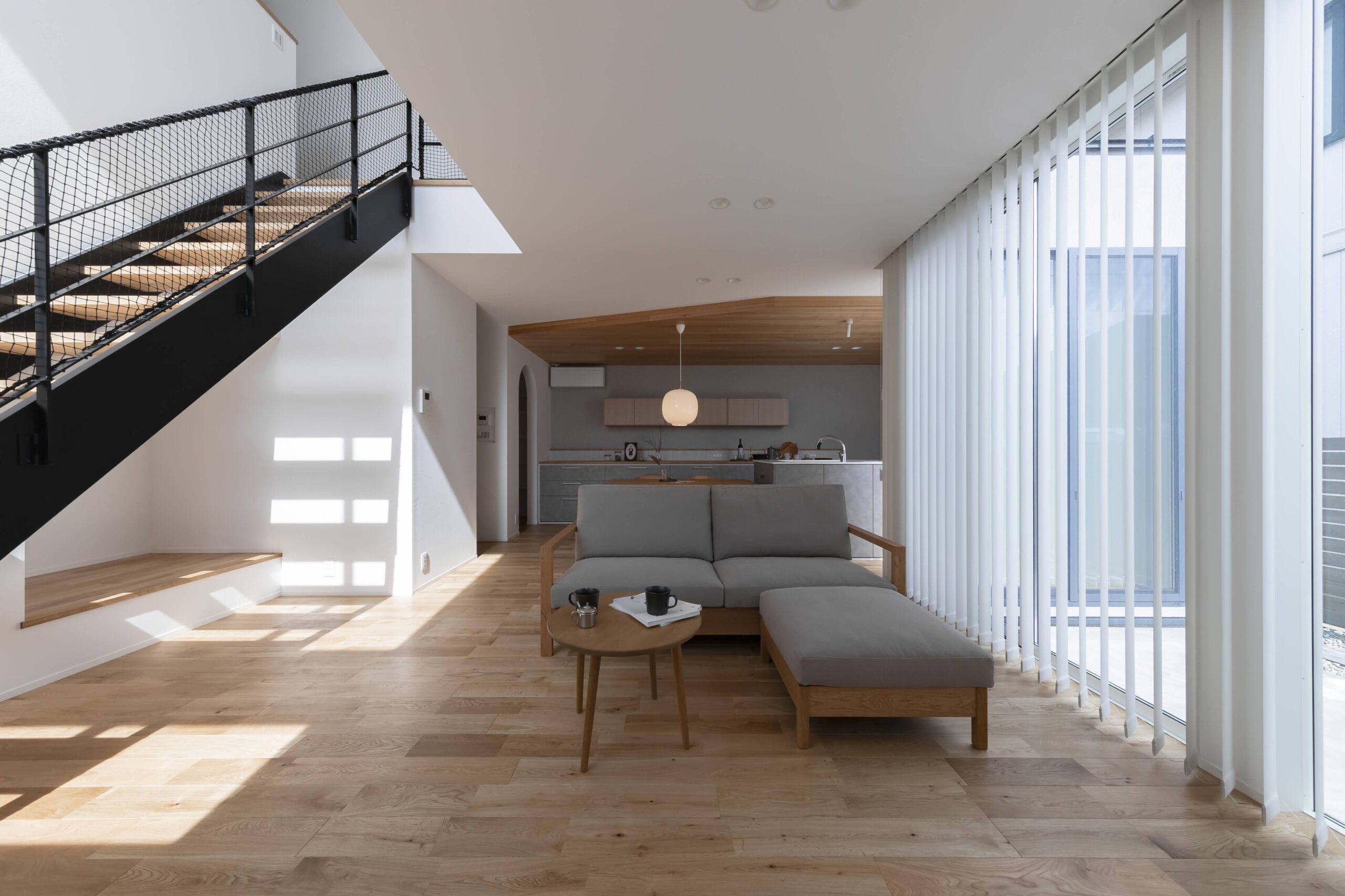 吹き抜けから光が降り注ぐLDKは、リビングから庭へとゆるやかにつながり、季節の風や光を感じながらくつろげる心地よい空間です。