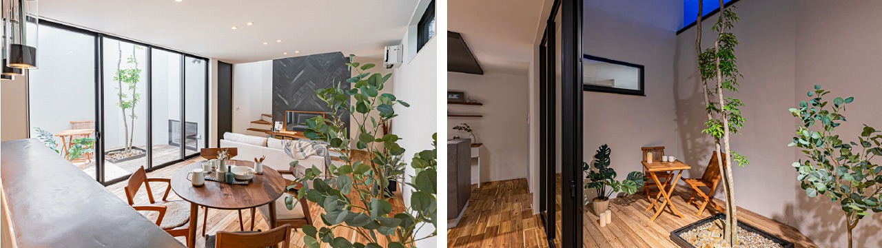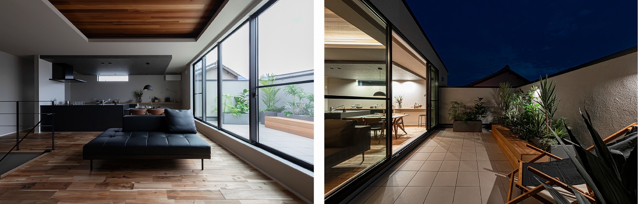 外部の視線や騒音をカットするように配置された中庭テラス。テラスを囲むように各部屋をレイアウトすることで、一日中カーテンレスで過ごせる空間に。