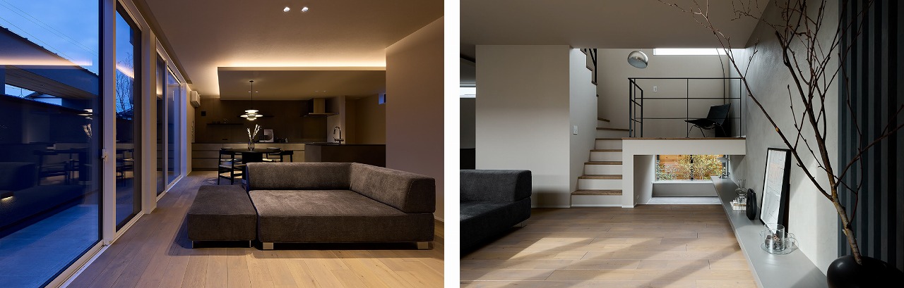 中庭の外壁は、外の視線をカットしながらも室内には十分な光が取り込める高さに設計されています。テラスを介して感じる四季折々の光が、豊かな暮らしを演出します。