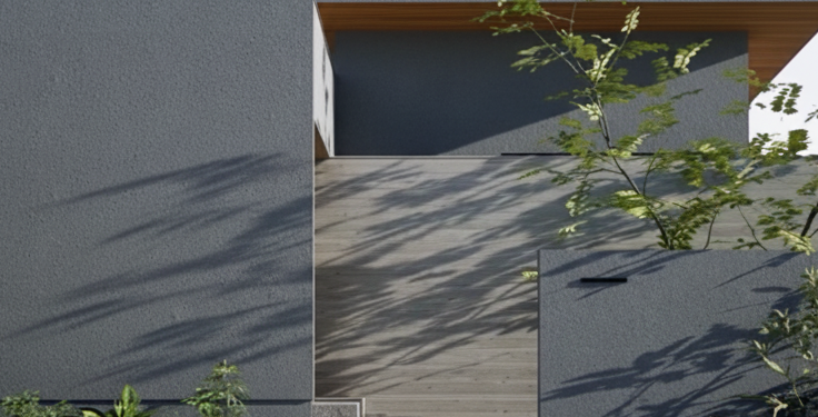 屋根には落ち着きのあるペールゴールドのガルバリウム鋼板、外壁はトラバーチン仕上げの塗り壁を採用。躯体には杉板調のモルタル仕上げを施し、立体感と陰影が美しく浮かび上がるよう設計されています。