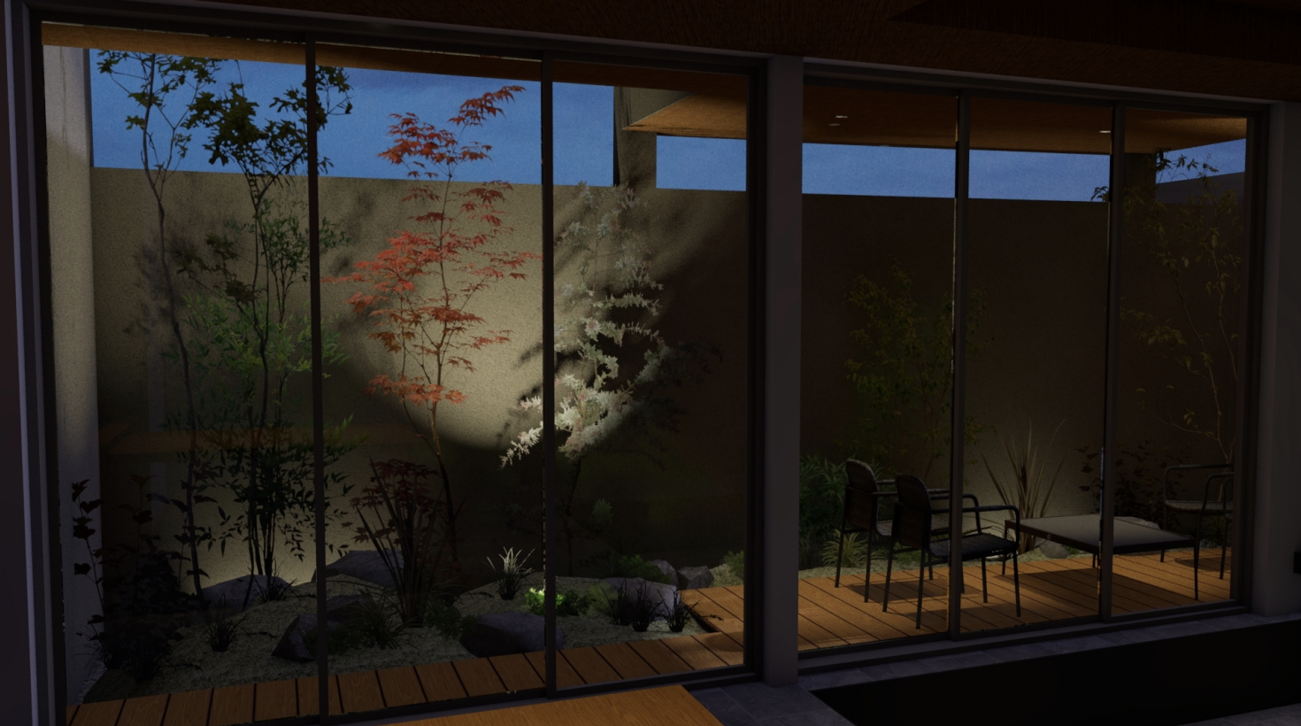 リビングで家族とくつろぎながら、ふと視線を中庭へ向けると、穏やかな緑と影が広がる。